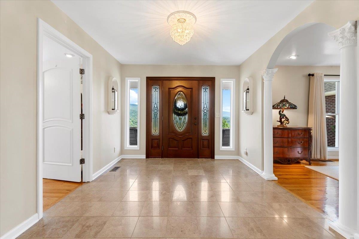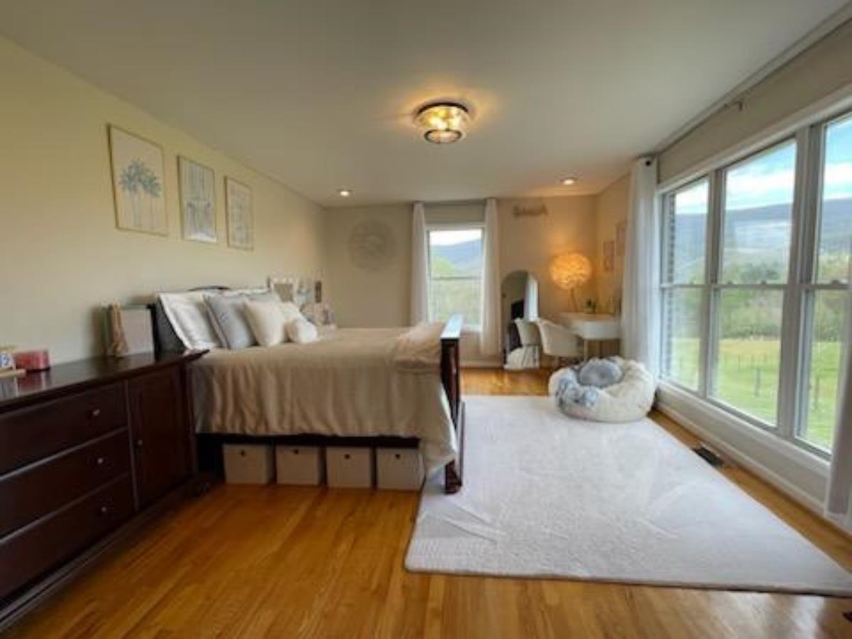 Spectacular views, privacy & exceptional quality abound @ this gentleman's farm located only minutes from VT. This custom built single owner brick & stone home w/primary living on the main level has a full beautifully finished walk-out lower level. The vaulted living room w/stone FP opens to the well appointed spacious kitchen & breakfast room. A gracious large primary suite w/a spa bath & walk-in closet is privately located from the other main level bedrooms. Hardwood & tile floors throughout the main level, granite tops, stainless appliances, tile baths are just a few of the amenities to enjoy. The lower level has a guest suite, office, wet bar, wood stove, gym, family room & extra storage. Outside relax on the huge patio & two porches, overlooking gorgeous mountain views & wet weather pond. Price includes a Generac generator, workshop, detached tractor garage, sheds, & fully fenced pastures, which are all in exceptional condition to run your very own farm, or rent land out & relax!