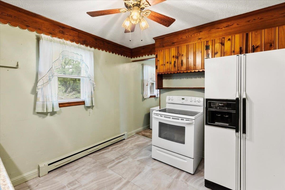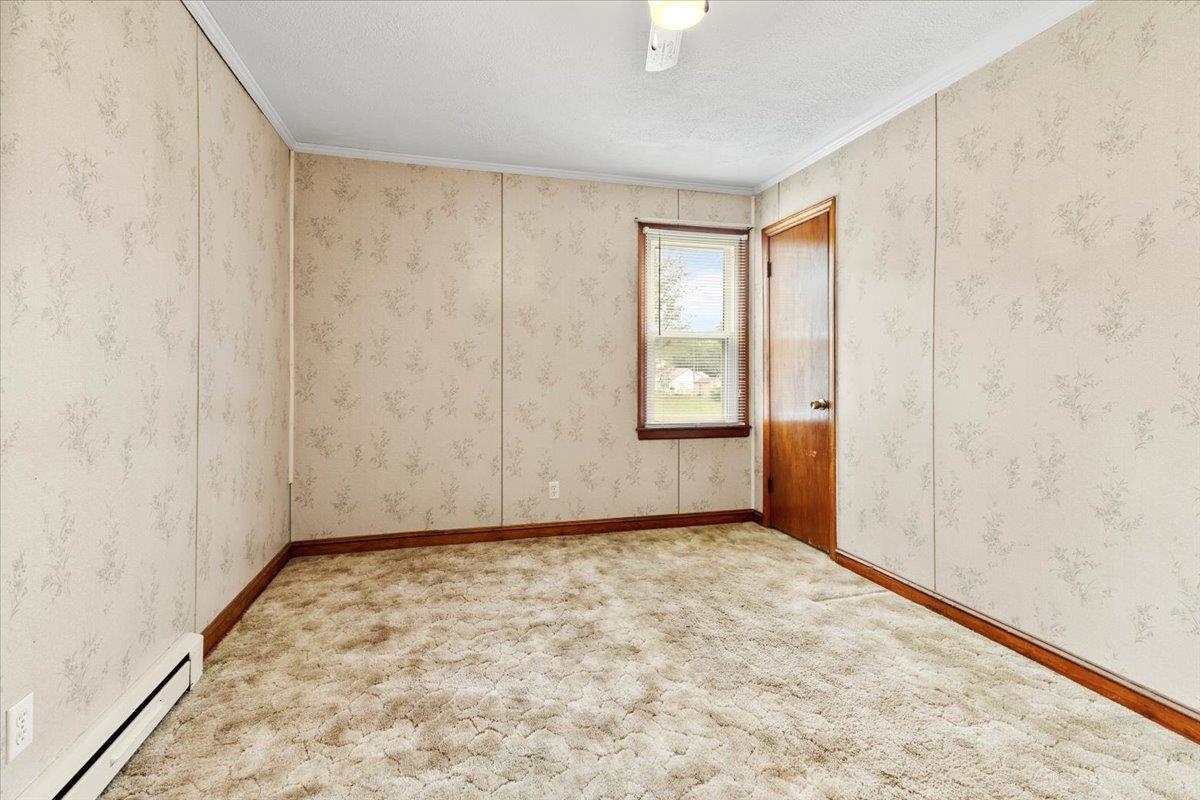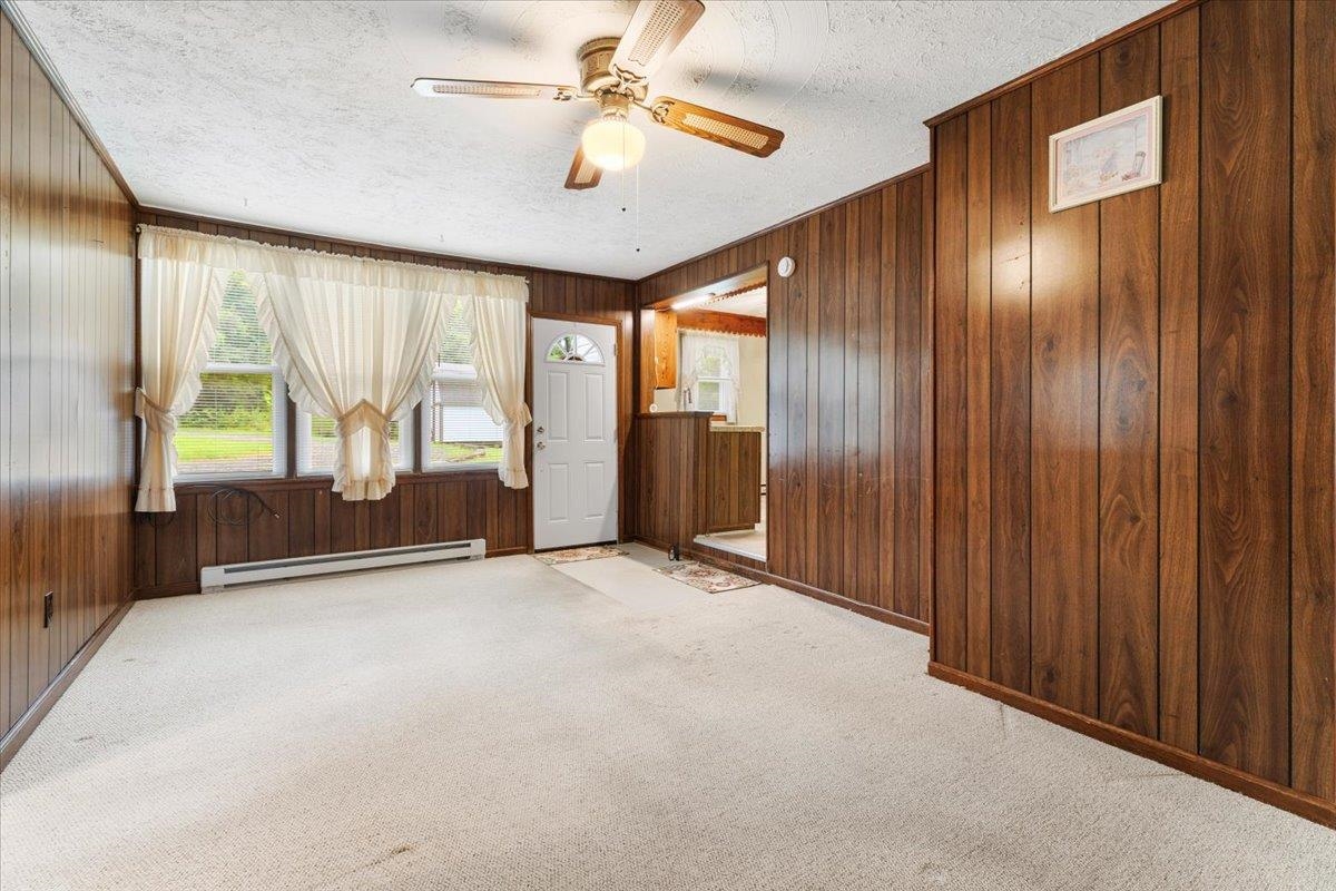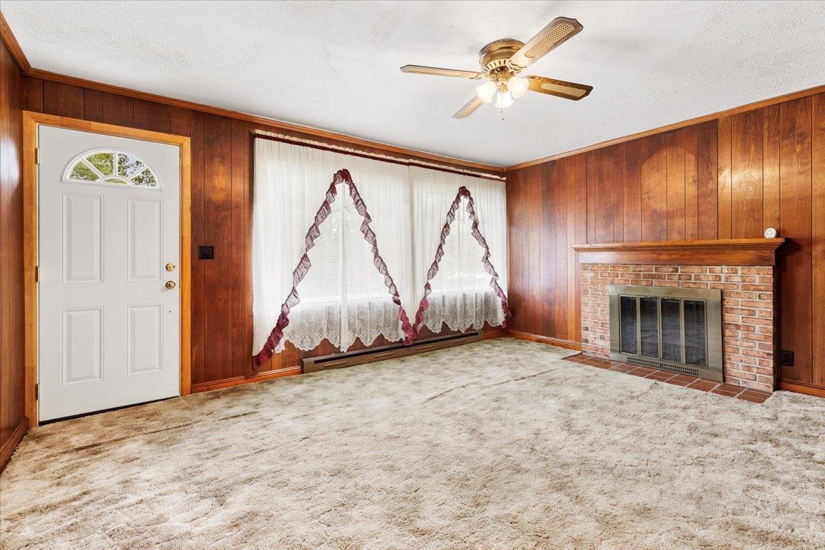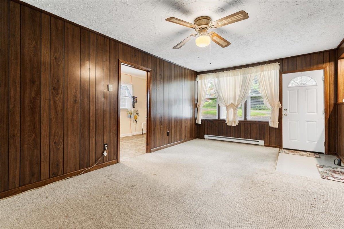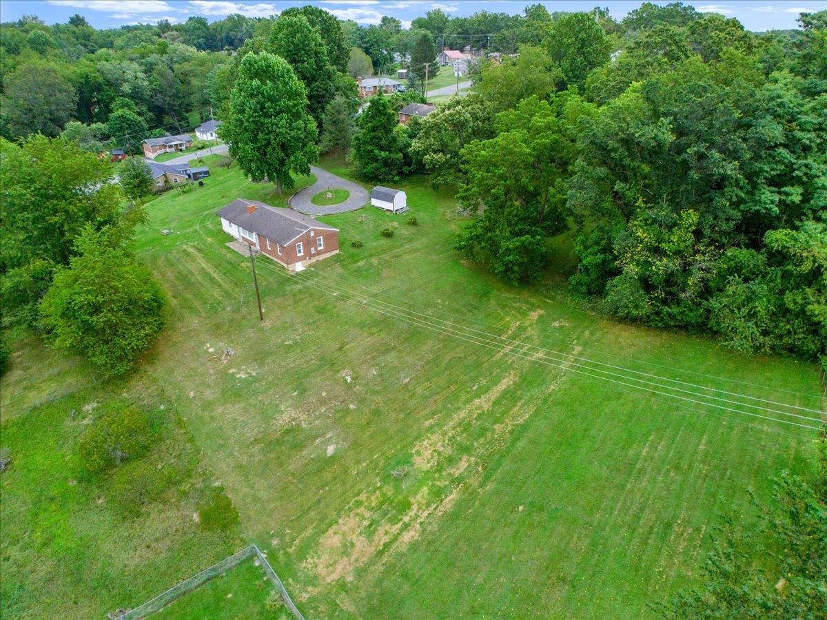 PRICE IMPROVEMENT - Charming Brick Ranch w/Vinyl trim w/3 BR & 1 Bth. Room to add 4th BR & Bath #2. This 0.88-acre property offers a perfect blend of comfort & potential, featuring ample living space & desirable updates. Spacious living room with brick fireplace and ceramic tile hearth (capped, not in use), formal dining room with flue. Large laundry room w/space to add a 2nd full bath, Kit- Recently updated w/NEW vinyl, Range & Ref convey, Carpet over HW in LR, hall, & all 3 BRS. Remodeled bath w/ceramic tile floor & 2 medicine cabinets. EBB w/Room controls, 4 window A/C units convey. MPT kerosene heater in DW convey. Outside - Stone Patio/Carpeted rear patio & stg Bldg w/RIDING MOWER CONVEYS. See documents for details. Septic system w/pump to public sewer. New replacement windows- 2005, DR table, six chairs, & Hutch convey. This well-maintained home offers a rare opportunity to own a large, private lot with great potential for future upgrades/expansion.