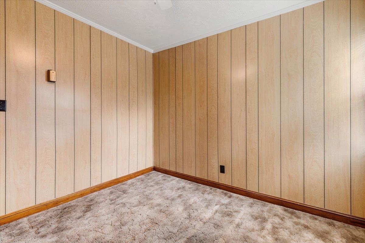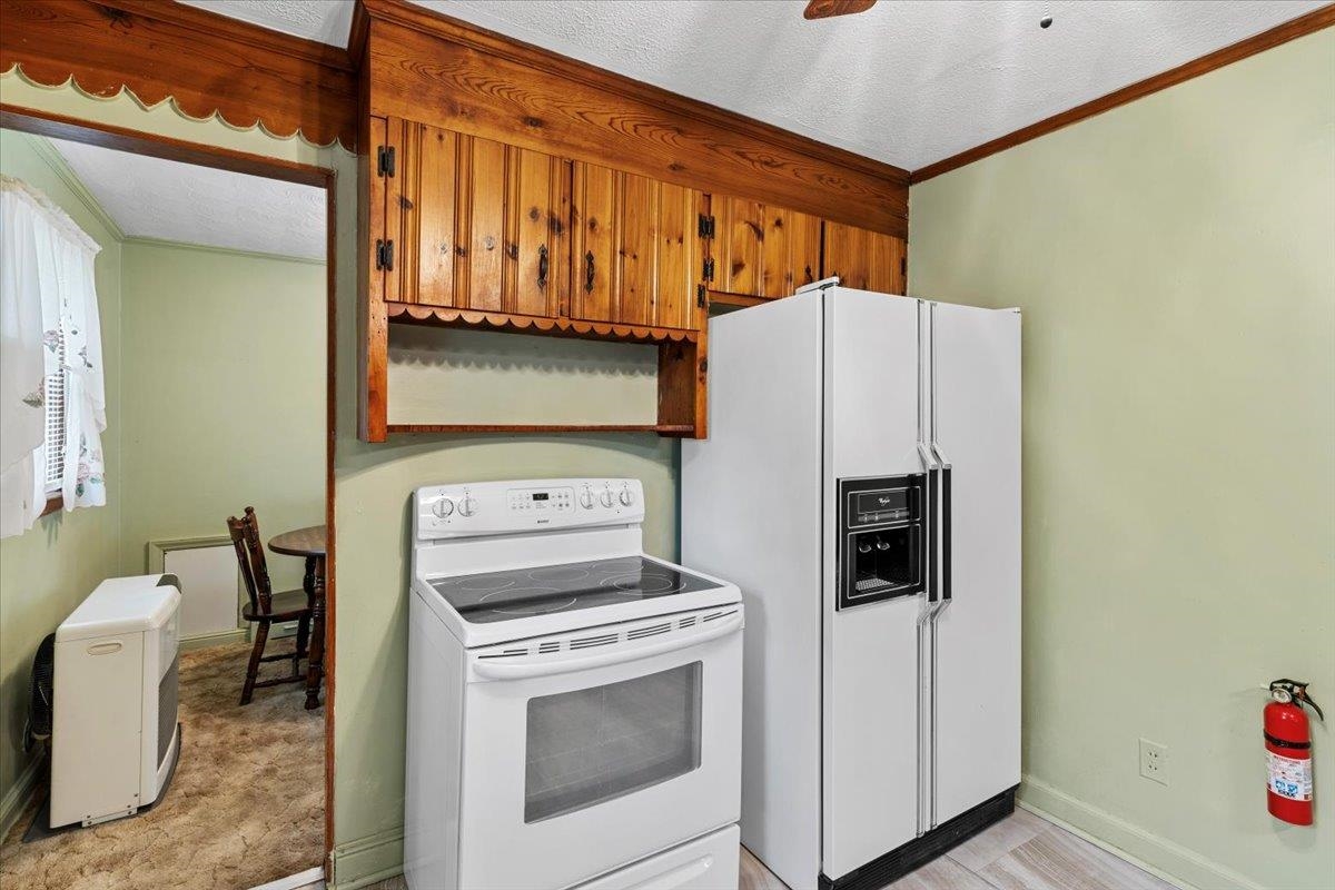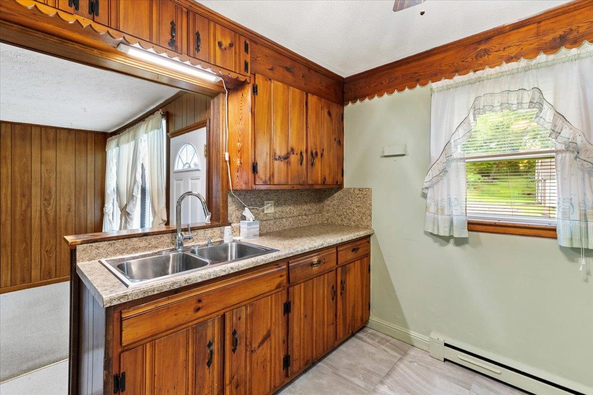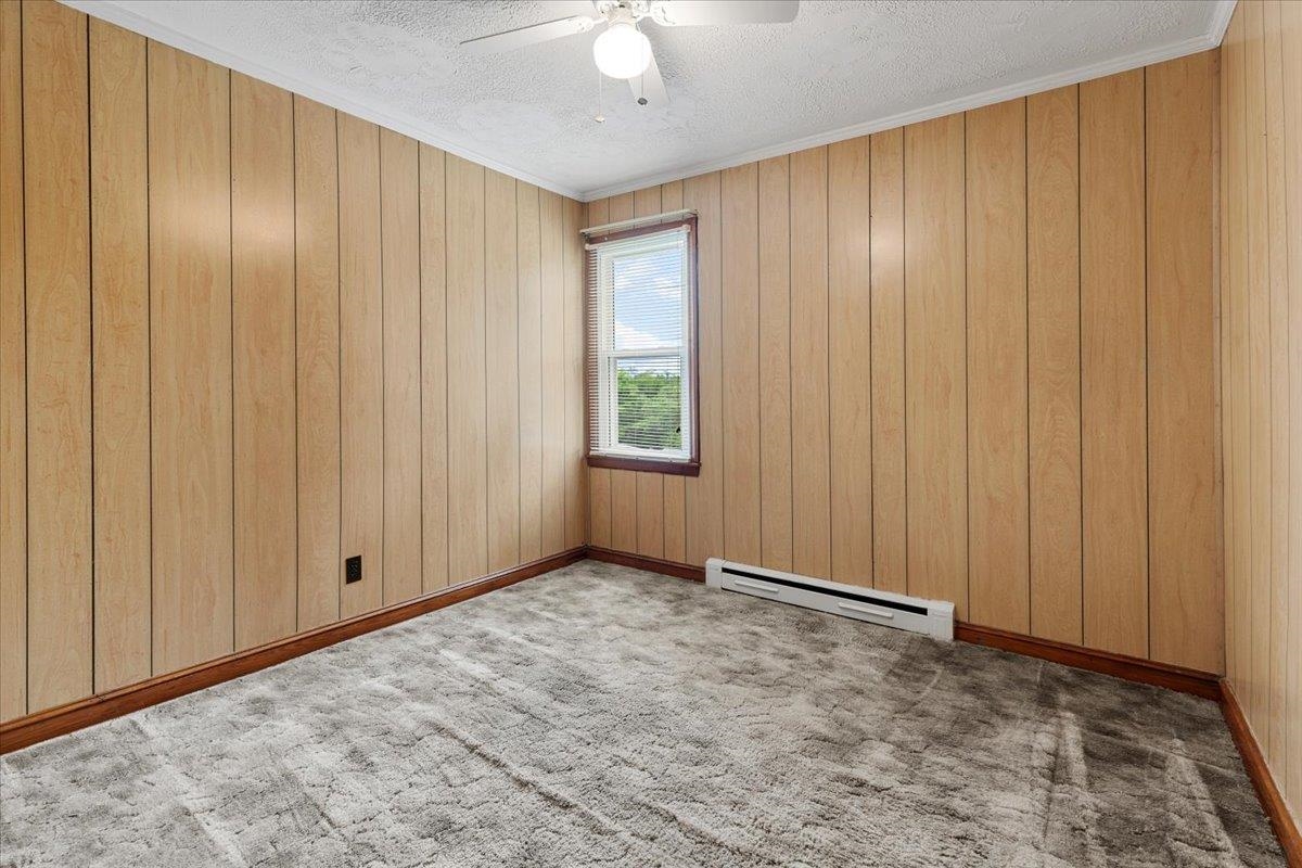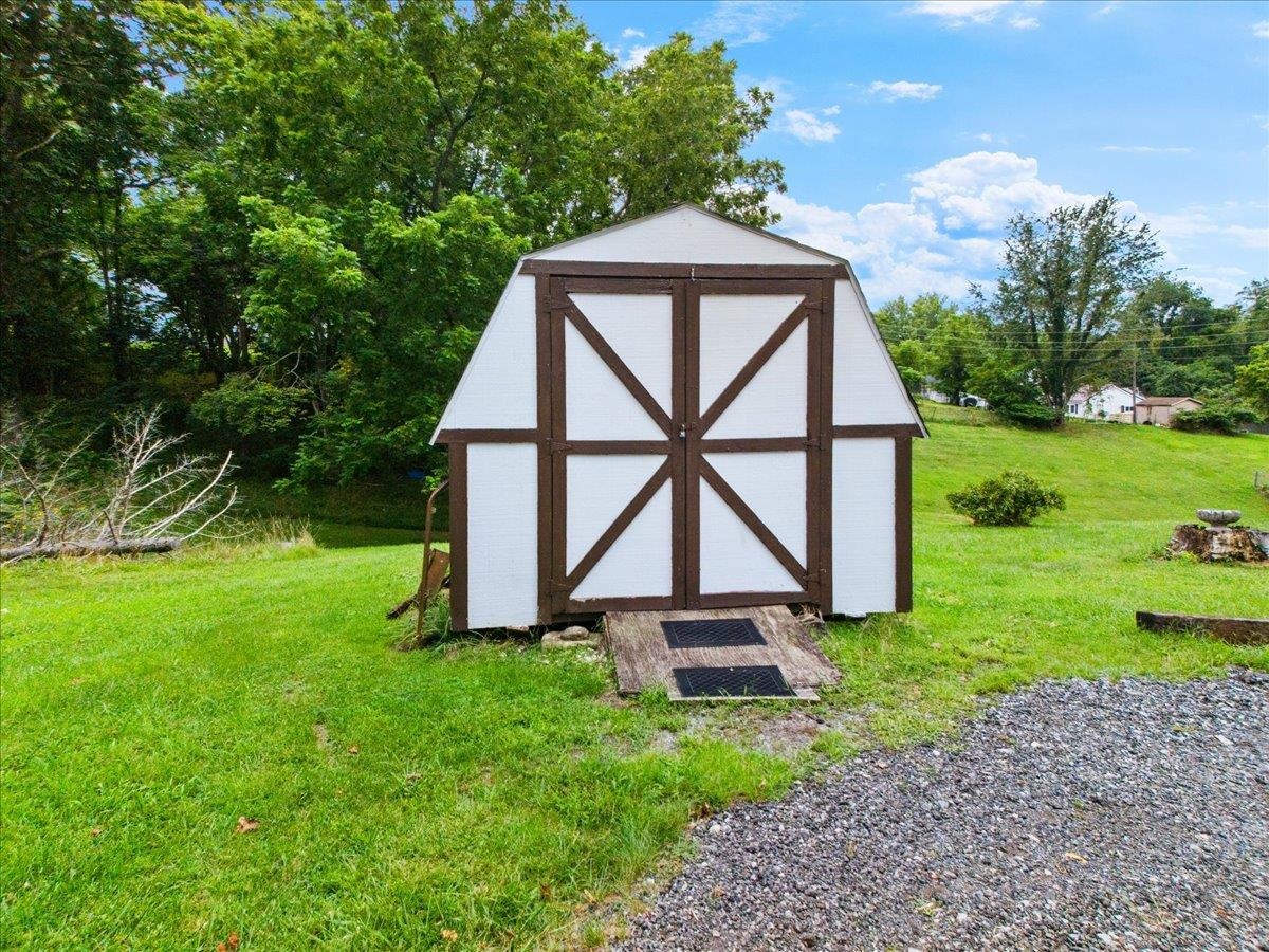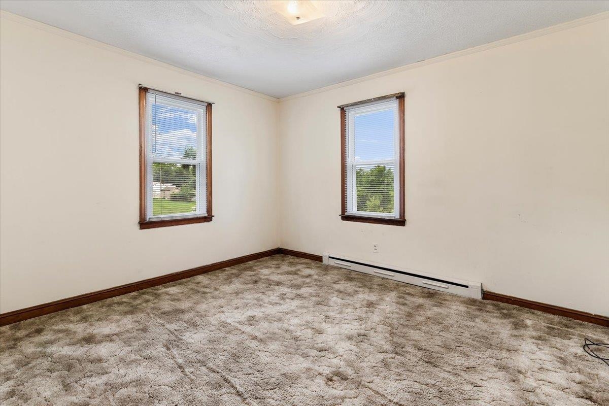 PRICE IMPROVEMENT - Charming Brick Ranch w/Vinyl trim w/3 BR & 1 Bth. Room to add 4th BR & Bath #2. This 0.88-acre property offers a perfect blend of comfort & potential, featuring ample living space & desirable updates. Spacious living room with brick fireplace and ceramic tile hearth (capped, not in use), formal dining room with flue. Large laundry room w/space to add a 2nd full bath, Kit- Recently updated w/NEW vinyl, Range & Ref convey, Carpet over HW in LR, hall, & all 3 BRS. Remodeled bath w/ceramic tile floor & 2 medicine cabinets. EBB w/Room controls, 4 window A/C units convey. MPT kerosene heater in DW convey. Outside - Stone Patio/Carpeted rear patio & stg Bldg w/RIDING MOWER CONVEYS. See documents for details. Septic system w/pump to public sewer. New replacement windows- 2005, DR table, six chairs, & Hutch convey. This well-maintained home offers a rare opportunity to own a large, private lot with great potential for future upgrades/expansion.