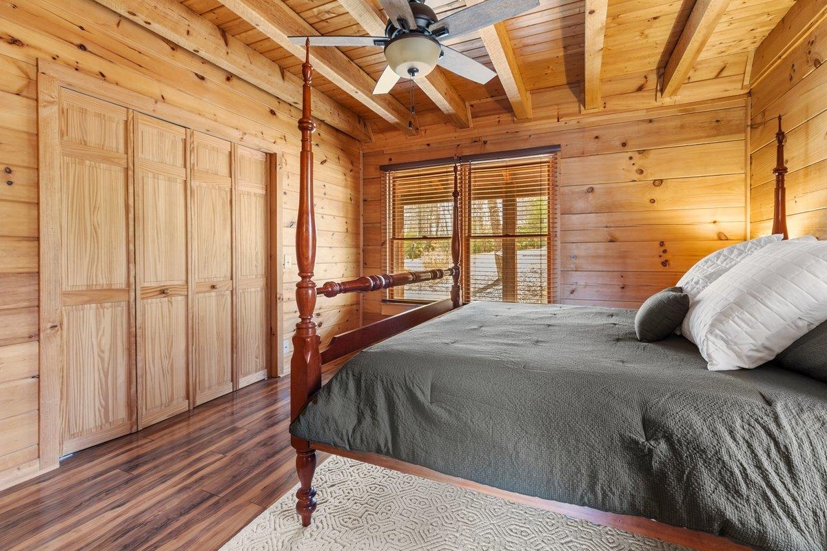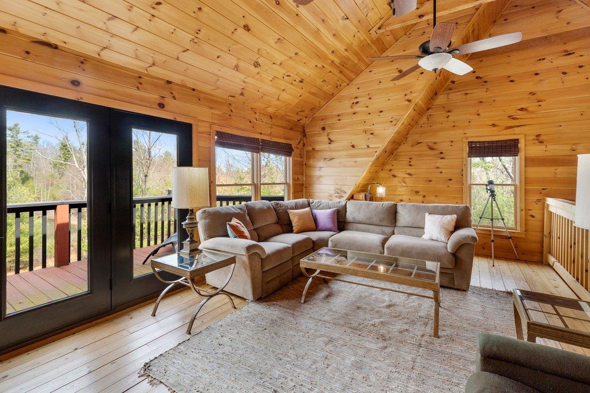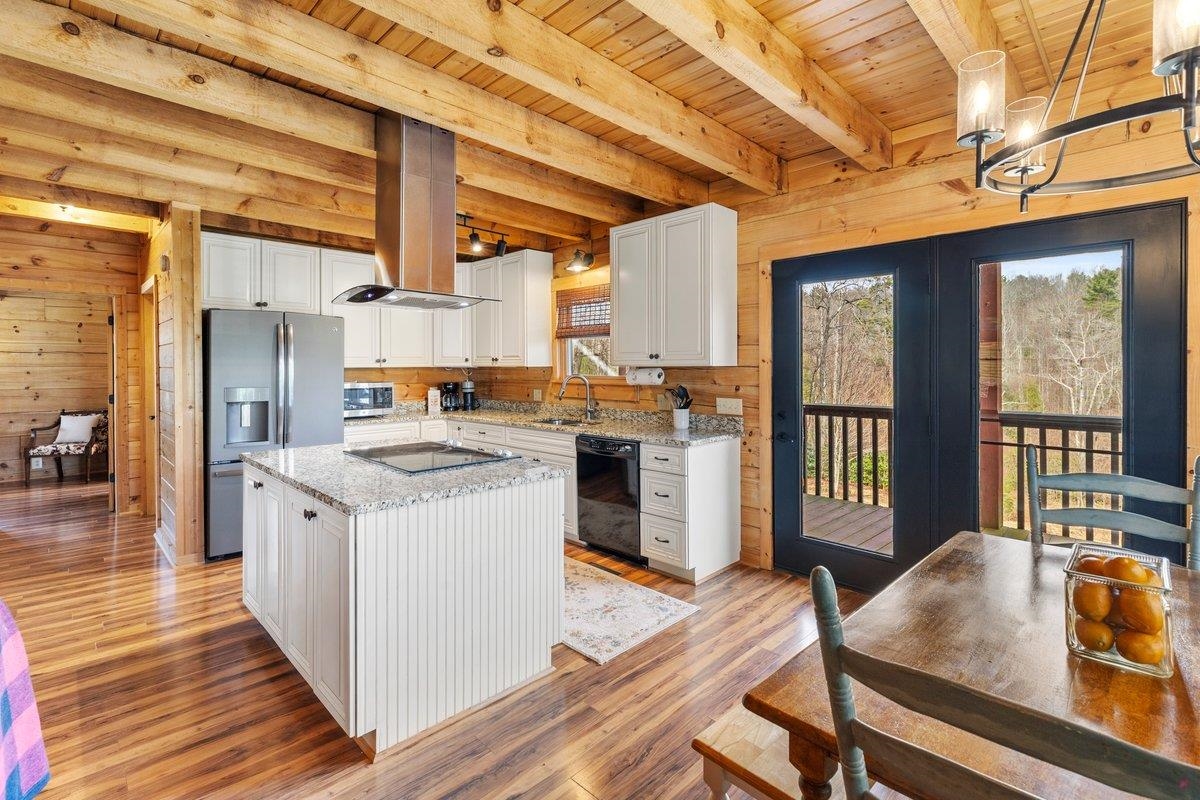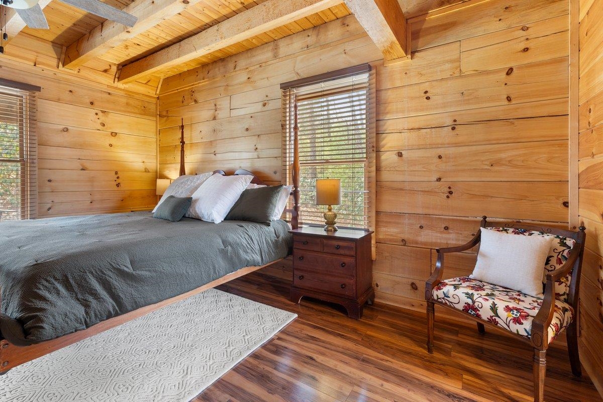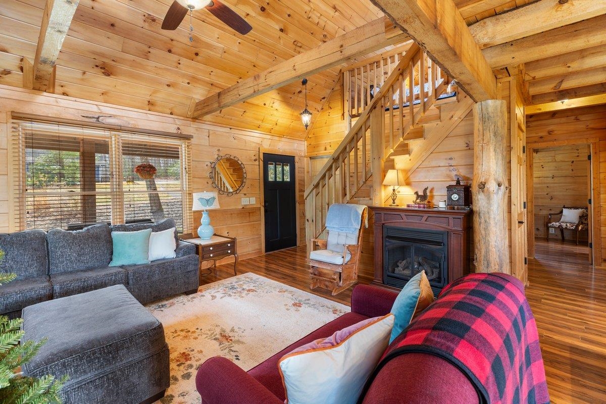 CABIN near GROUNDHOG MOUNTAIN OVERLOOK - Tucked away in a serene setting yet easily accessible, this beautiful multi-level log cabin is located just off the Blue Ridge County Parkway and in close proximity to the scenic Groundhog Mountain Overlook. Inside, you'll find cathedral ceilings with exposed beams, knotty pine throughout, & a gas log fireplace that anchors the inviting open floor plan. The kitchen features beautiful custom cabinetry, granite countertops, an oversized pantry, & all appliances convey. The spacious layout includes three bedrooms, two full baths, & one half bath, along with walk in closet and whole house generator. Outdoor spaces are just as impressive, with a paved driveway, two storage sheds, covered porch, several balconies & decks, and a stone patio - all overlooking a peaceful pond & the surrounding natural beauty. This property offers the perfect balance of seclusion, charm, & convenience. Don't miss this opportunity!