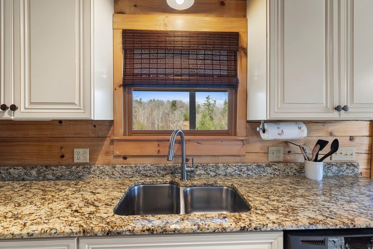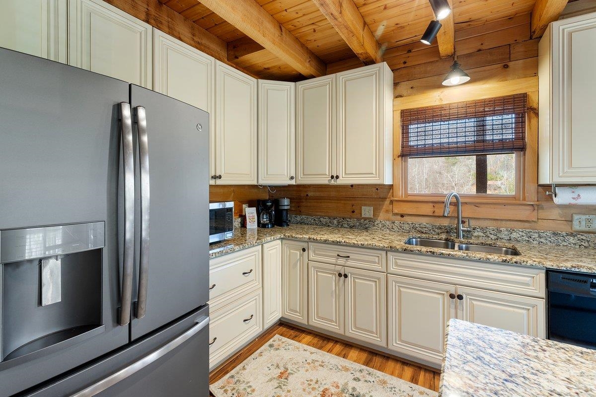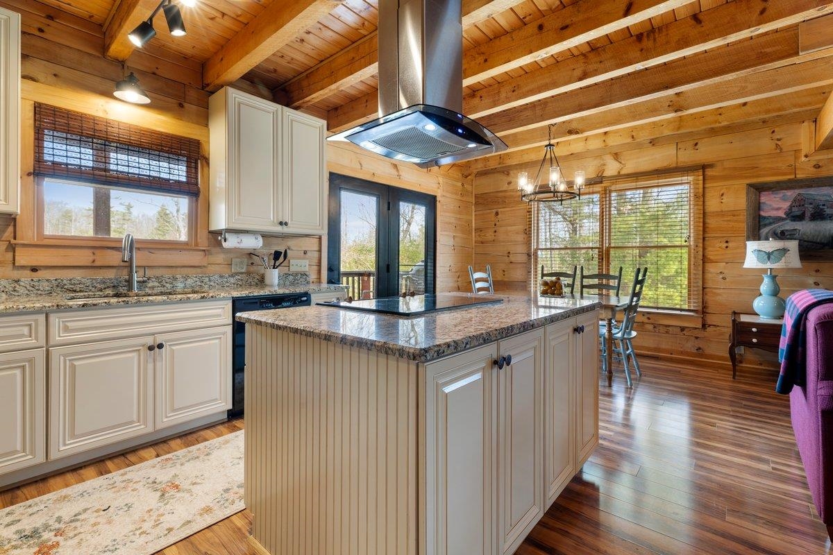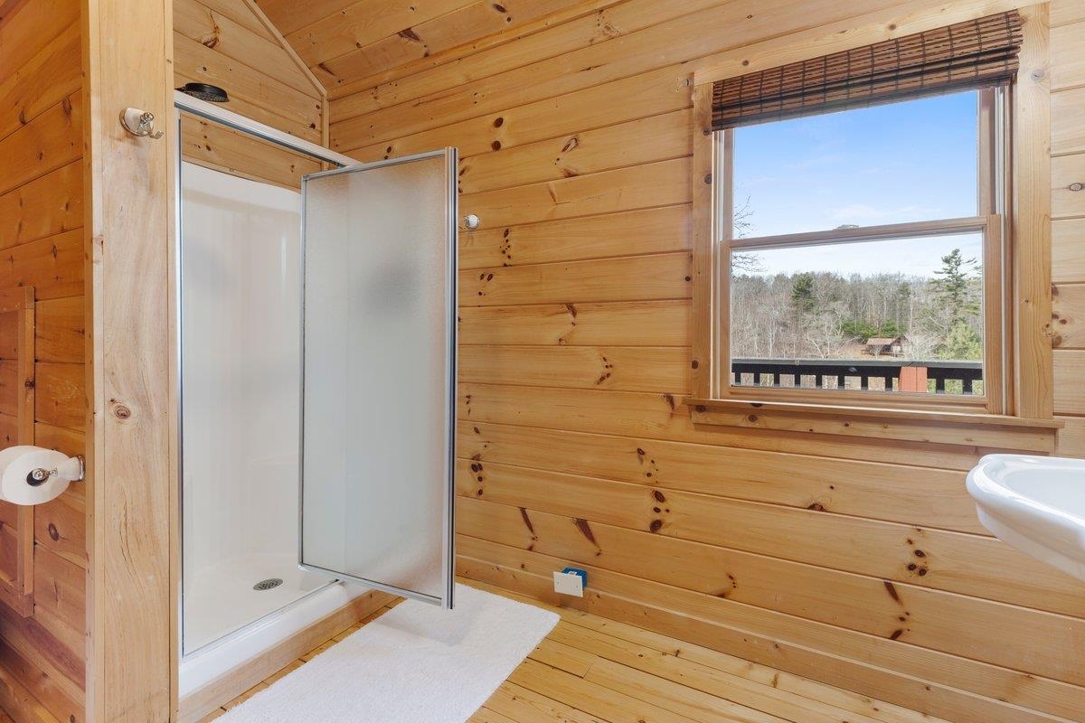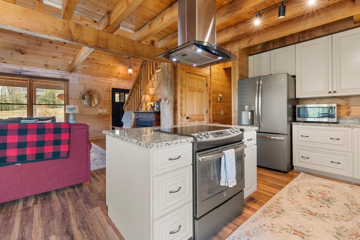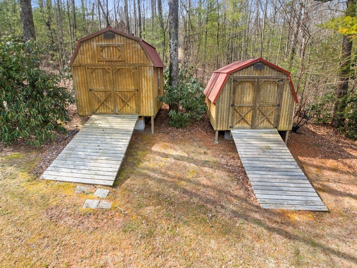 CABIN near GROUNDHOG MOUNTAIN OVERLOOK - Tucked away in a serene setting yet easily accessible, this beautiful multi-level log cabin is located just off the Blue Ridge County Parkway and in close proximity to the scenic Groundhog Mountain Overlook. Inside, you'll find cathedral ceilings with exposed beams, knotty pine throughout, & a gas log fireplace that anchors the inviting open floor plan. The kitchen features beautiful custom cabinetry, granite countertops, an oversized pantry, & all appliances convey. The spacious layout includes three bedrooms, two full baths, & one half bath, along with walk in closet and whole house generator. Outdoor spaces are just as impressive, with a paved driveway, two storage sheds, covered porch, several balconies & decks, and a stone patio - all overlooking a peaceful pond & the surrounding natural beauty. This property offers the perfect balance of seclusion, charm, & convenience. Don't miss this opportunity!
