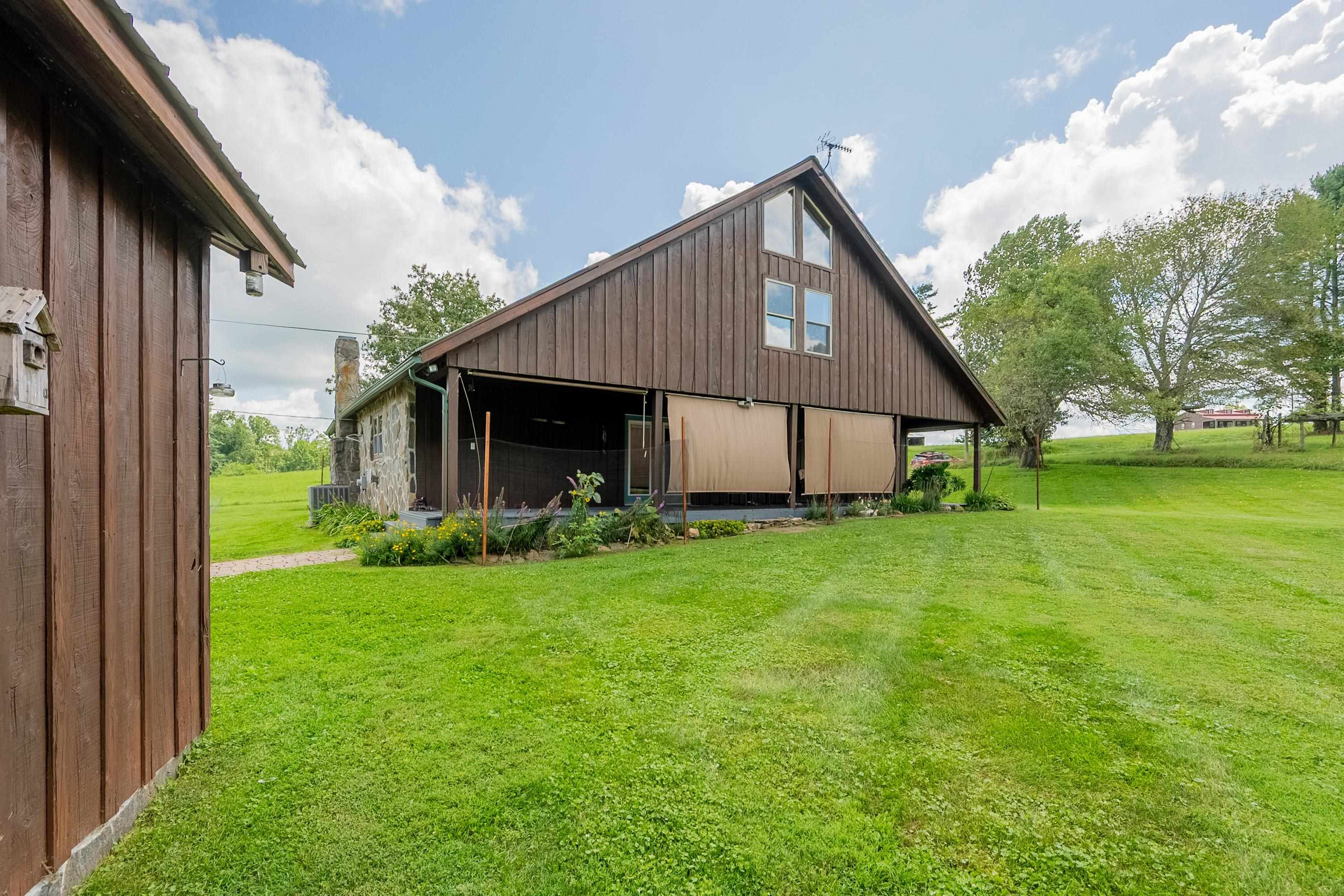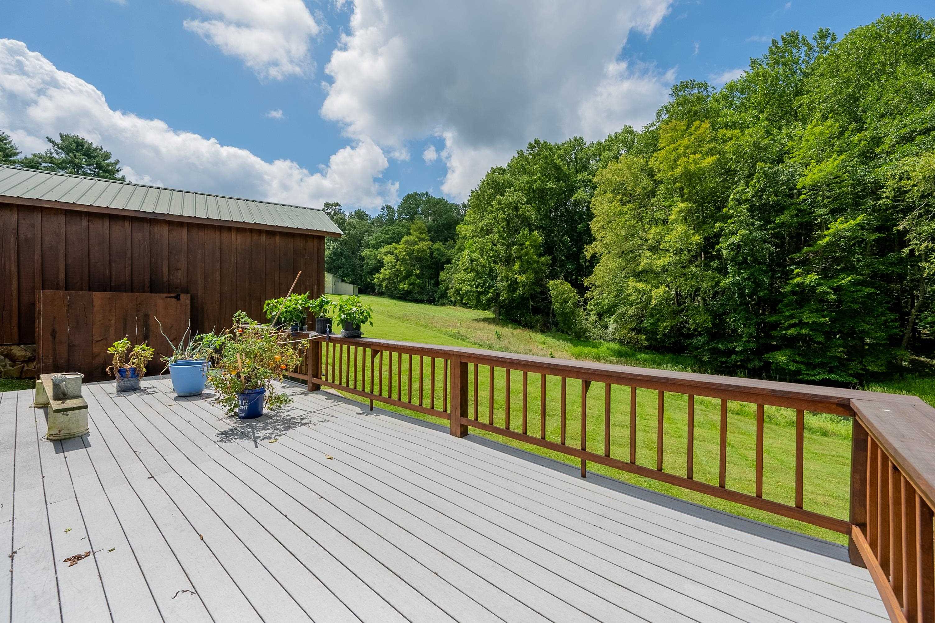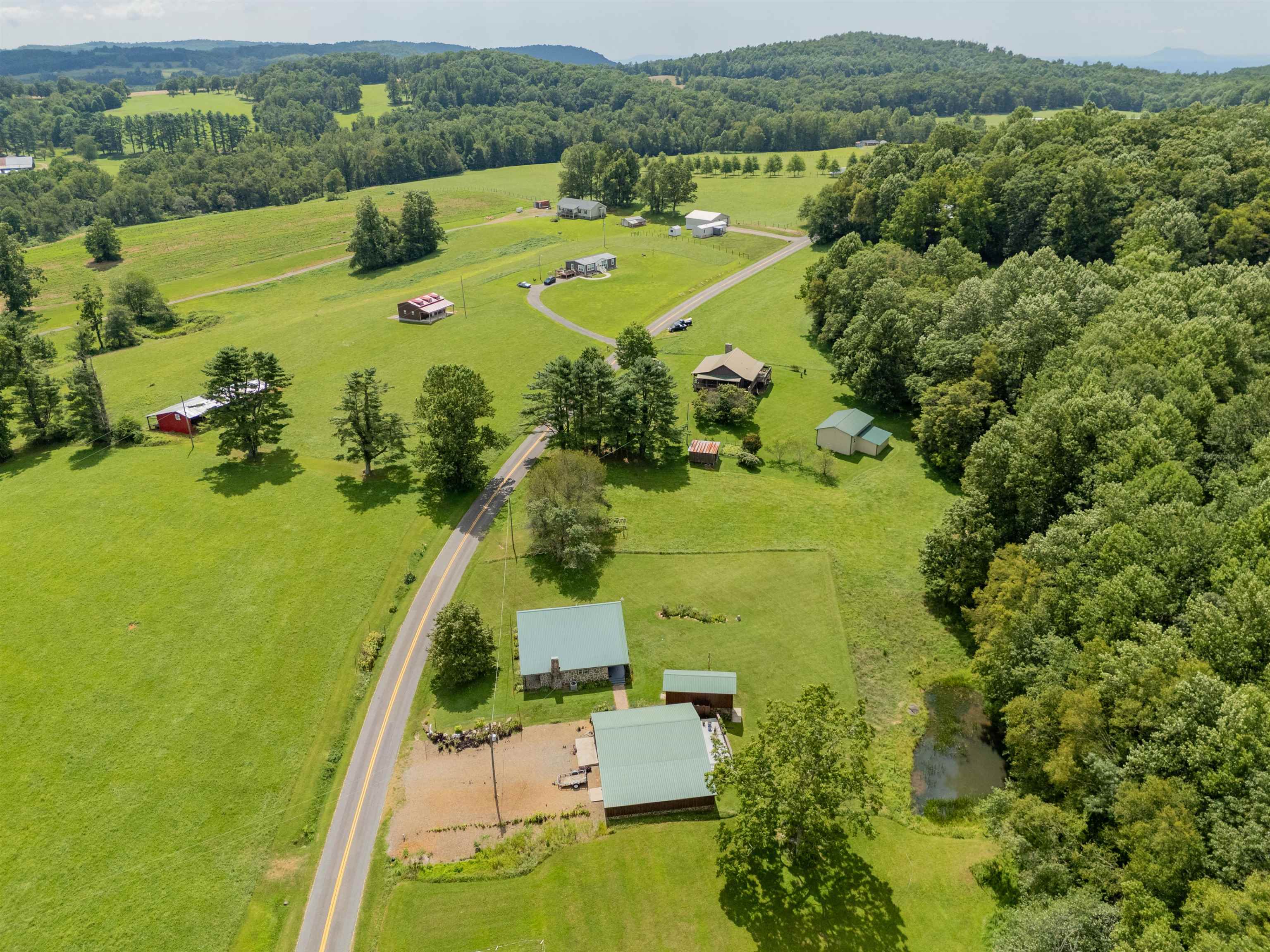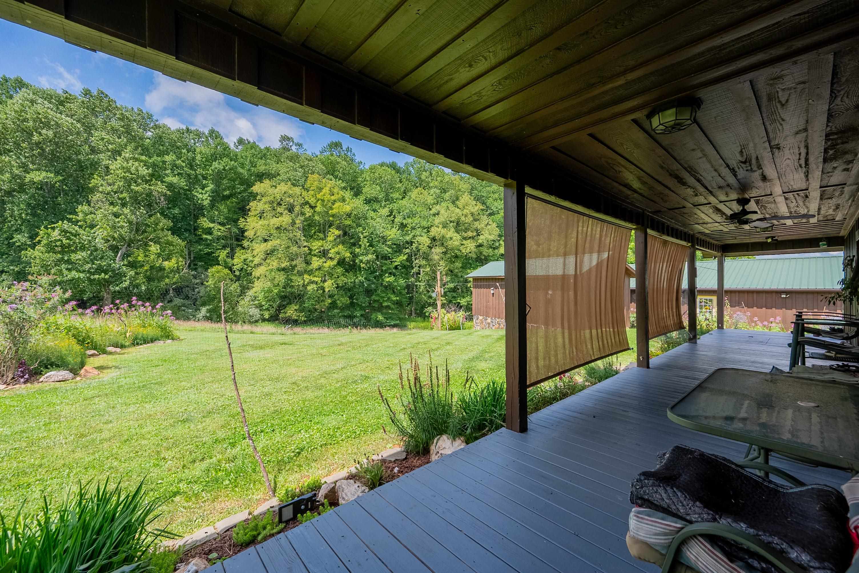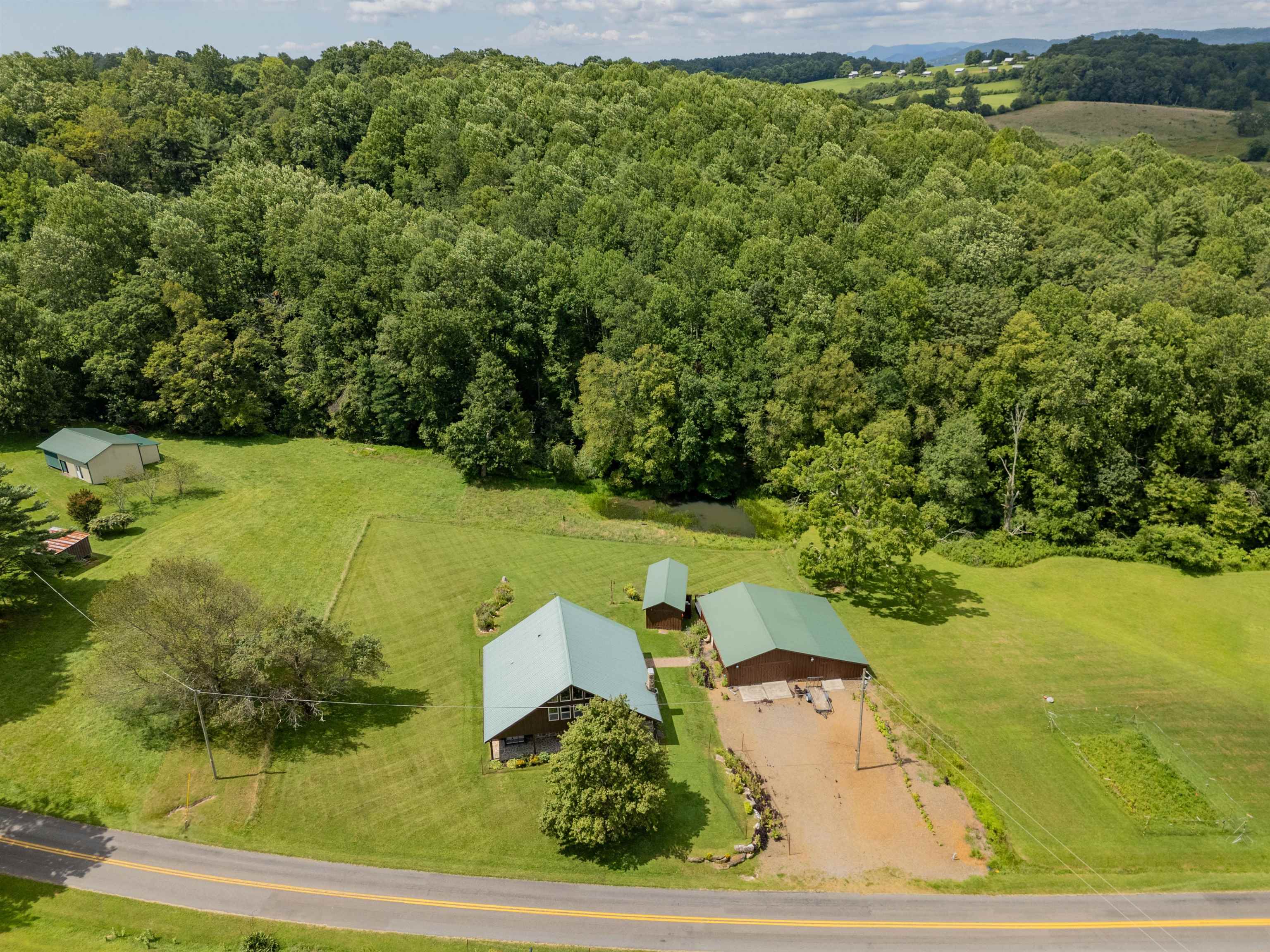 A quiet piece of paradise just off the Blue Ridge Parkway! Beautifully landscaped with flower gardens and fruit trees, this spotlessly maintained contemporary cabin offers 2,400 sq ft of living space. Handcrafted hardwood floors and unique wormy curly maple and white ash cabinetry with epoxy countertops and stainless backsplash create a truly custom kitchen. A striking stone fireplace with gas logs adds warmth to the living area. The thoughtful design incorporates the original 1940s structure into a spacious, inviting home—perfect as a family residence or vacation rental. Indulge in the luxury of a clawfoot tub and private sauna. Two detached buildings offer incredible flexibility: one functions as a radiant-heated gym/yoga studio with a peaceful deck, while the other houses a woodworking shop and lower-level workspace. A side structure provides extra storage for tools. Come experience this tranquil, one-of-a-kind mountain retreat!
