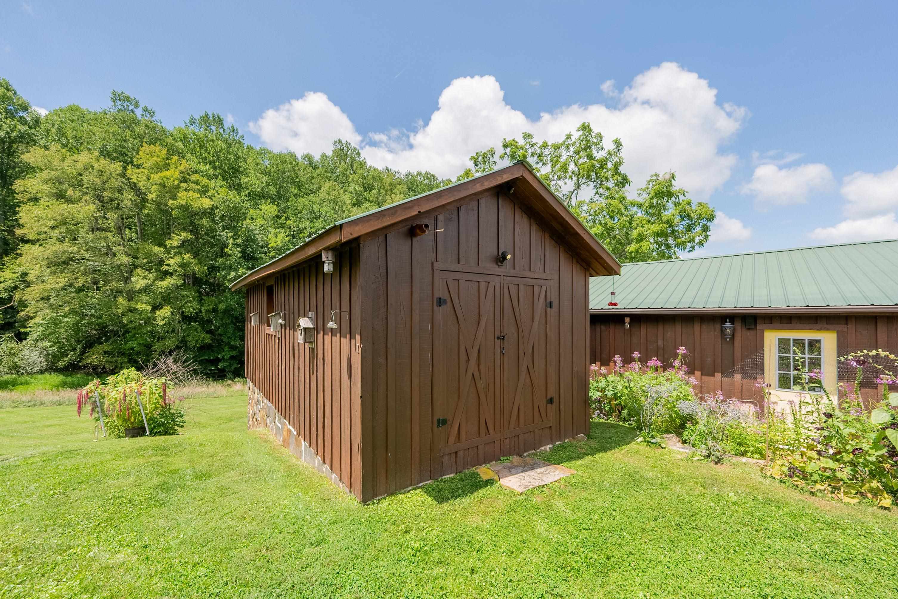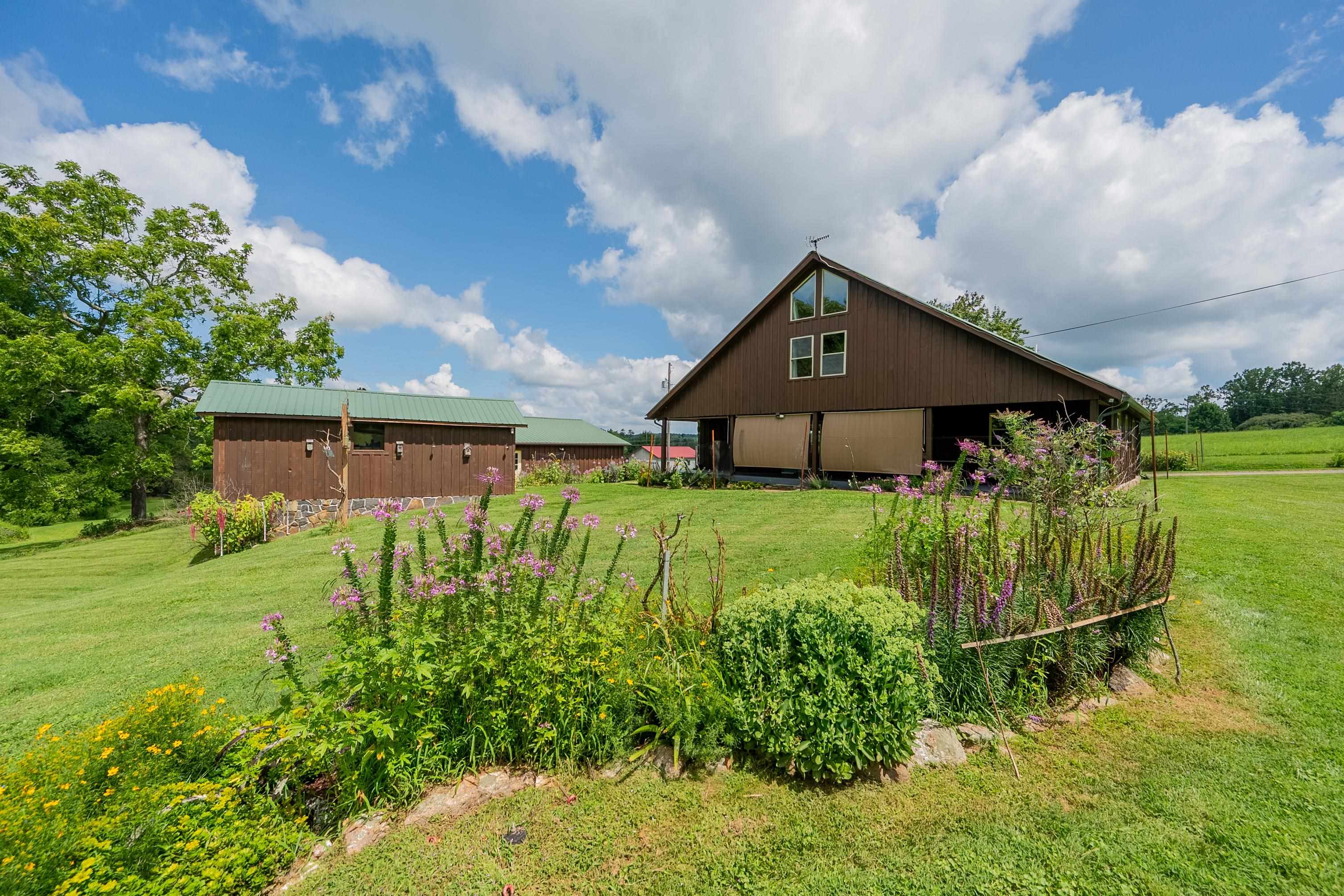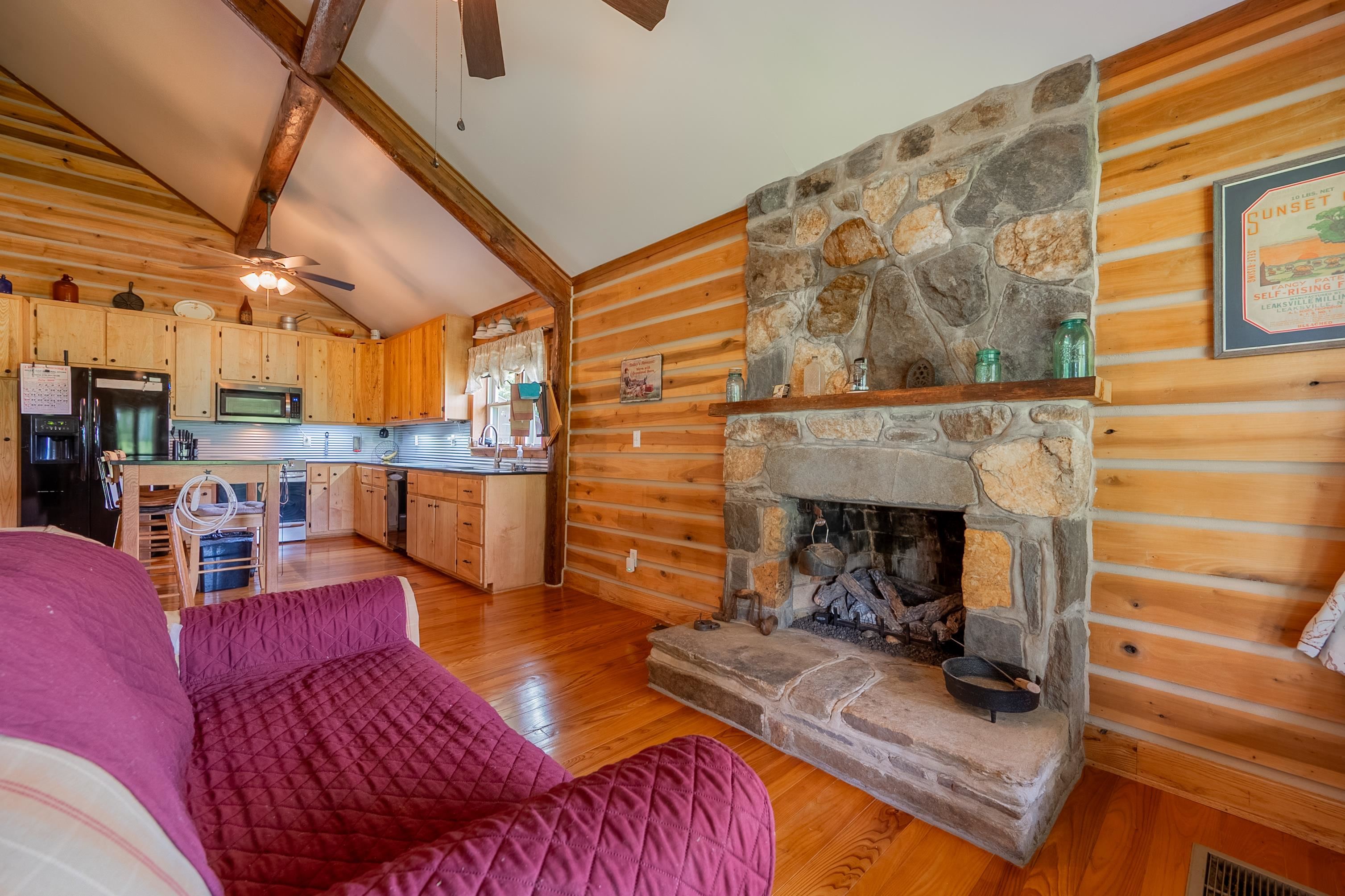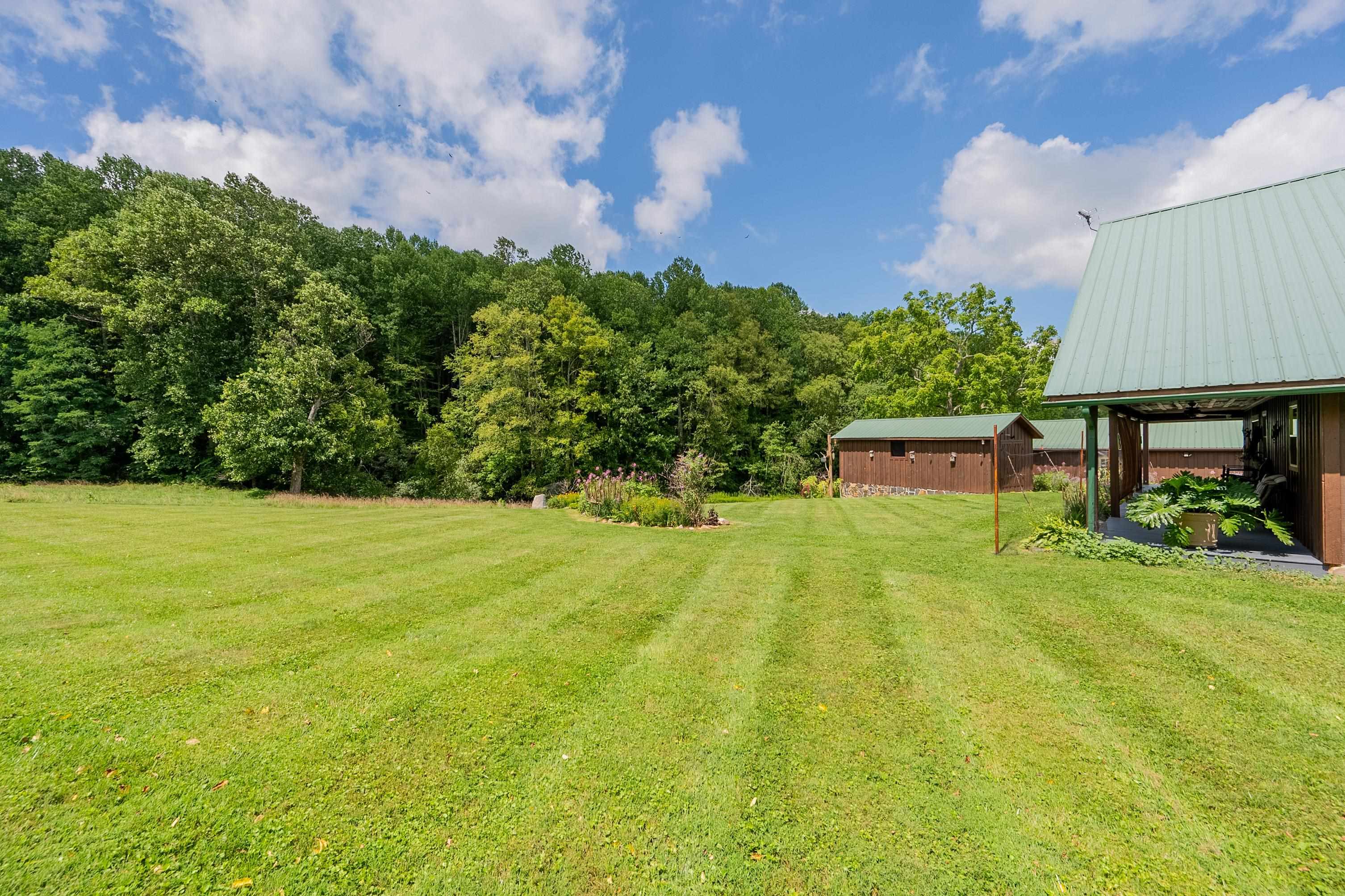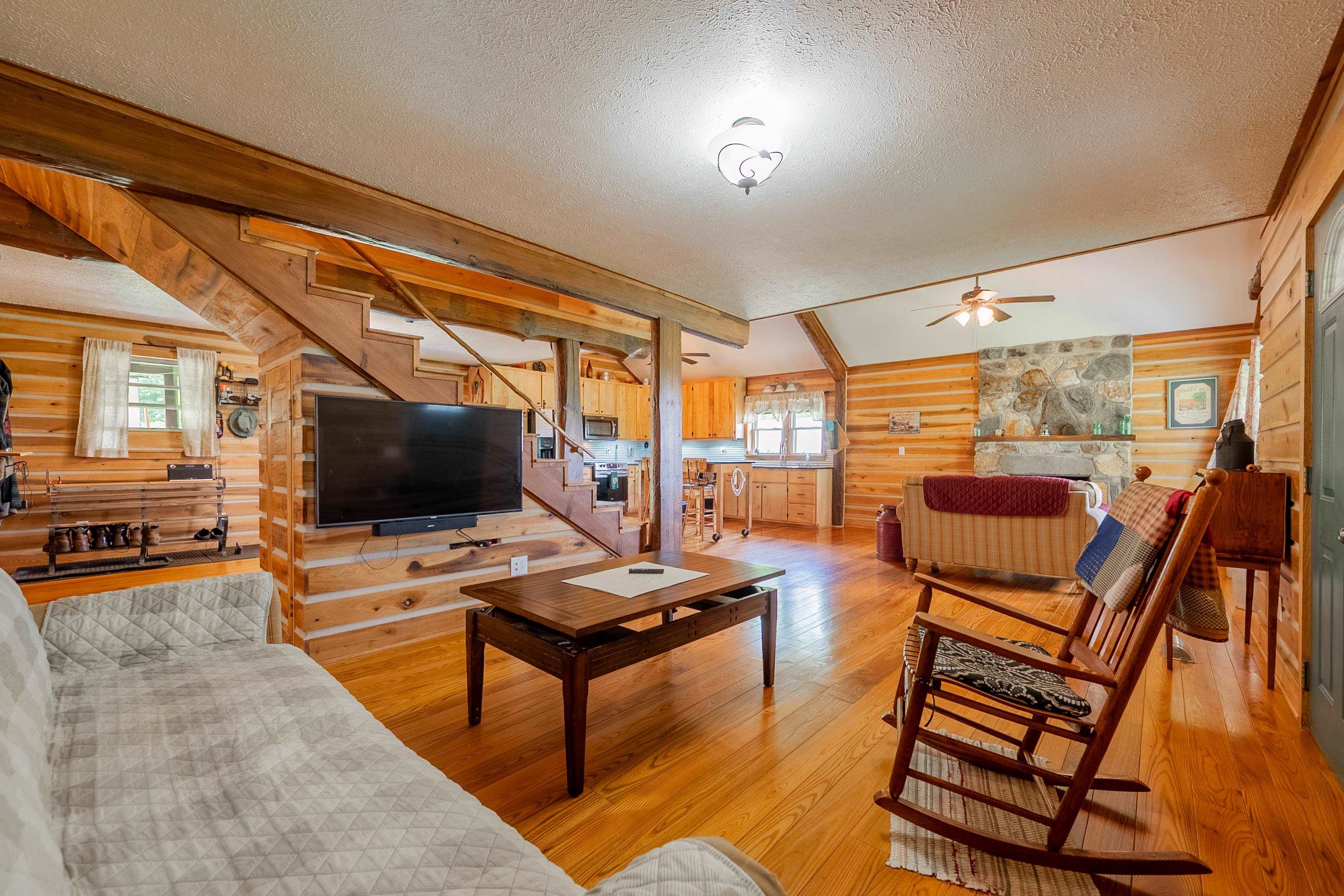 A quiet piece of paradise just off the Blue Ridge Parkway! Beautifully landscaped with flower gardens and fruit trees, this spotlessly maintained contemporary cabin offers 2,400 sq ft of living space. Handcrafted hardwood floors and unique wormy curly maple and white ash cabinetry with epoxy countertops and stainless backsplash create a truly custom kitchen. A striking stone fireplace with gas logs adds warmth to the living area. The thoughtful design incorporates the original 1940s structure into a spacious, inviting home—perfect as a family residence or vacation rental. Indulge in the luxury of a clawfoot tub and private sauna. Two detached buildings offer incredible flexibility: one functions as a radiant-heated gym/yoga studio with a peaceful deck, while the other houses a woodworking shop and lower-level workspace. A side structure provides extra storage for tools. Come experience this tranquil, one-of-a-kind mountain retreat!