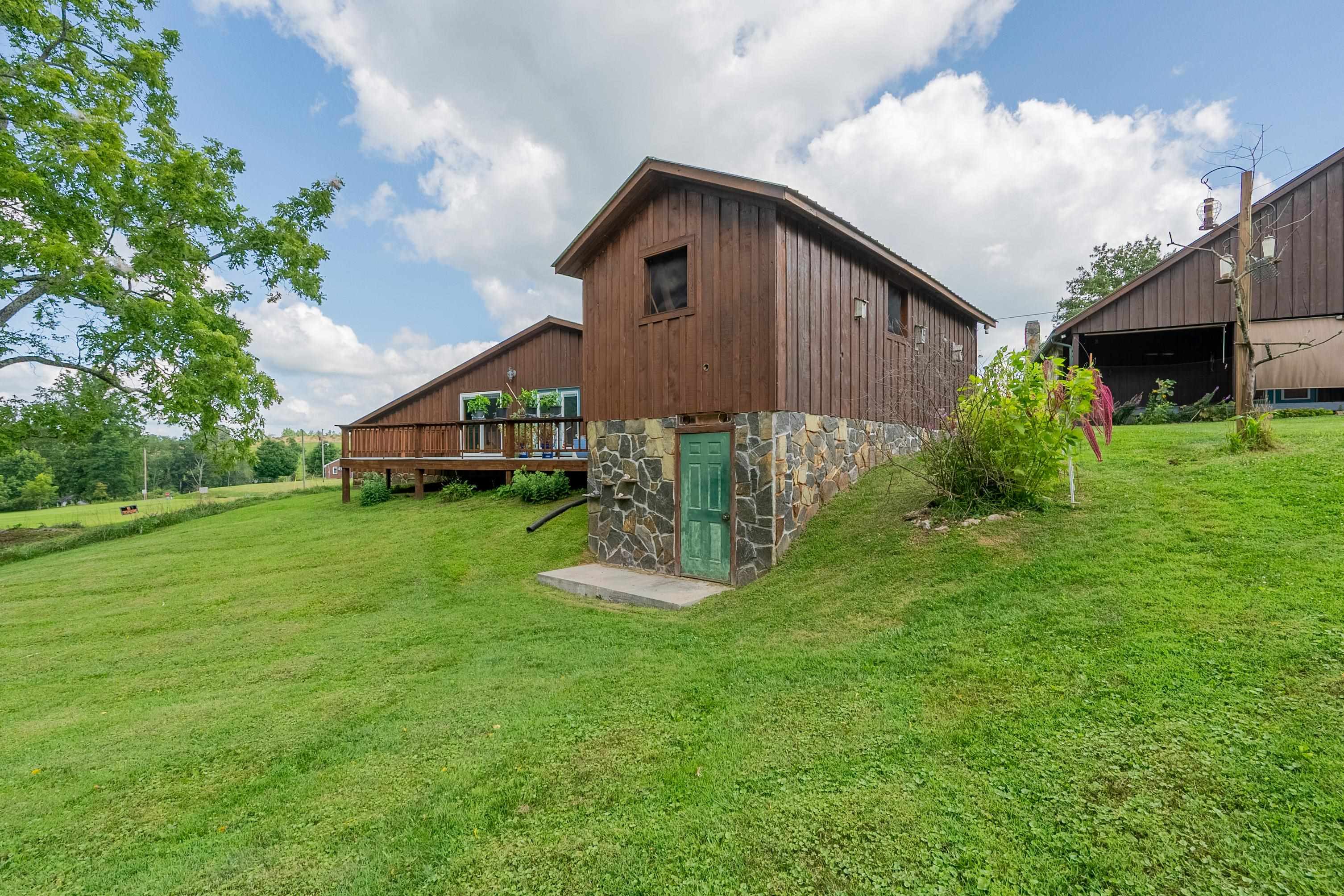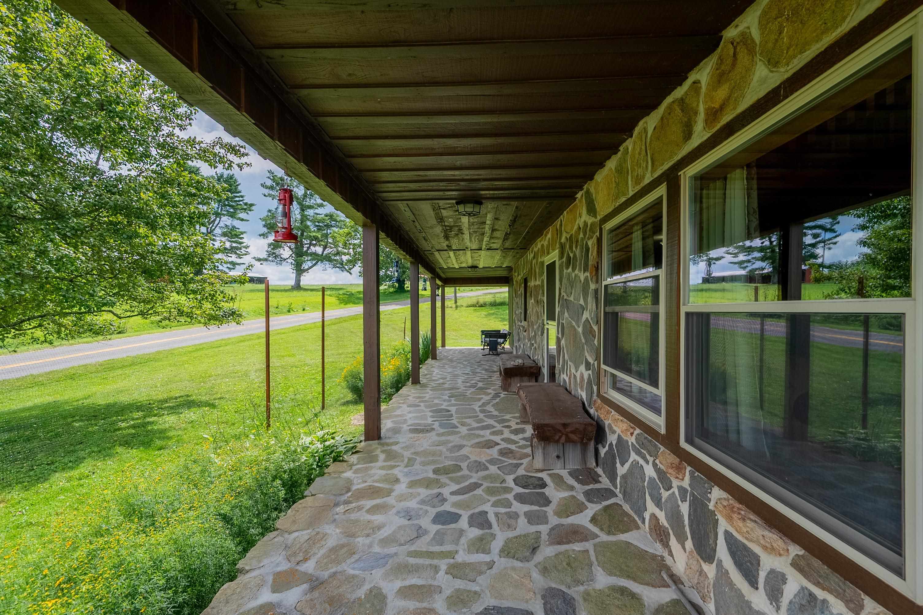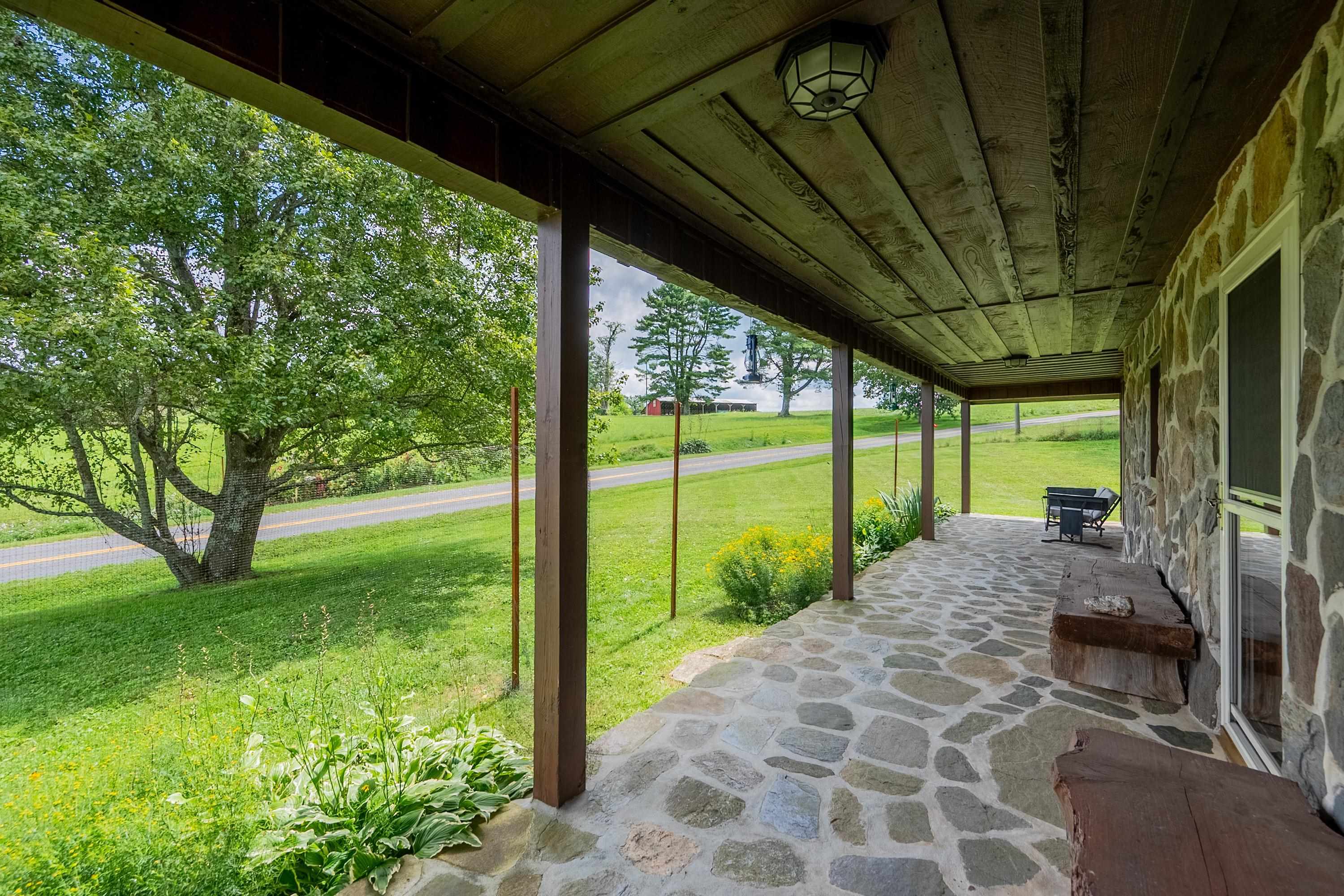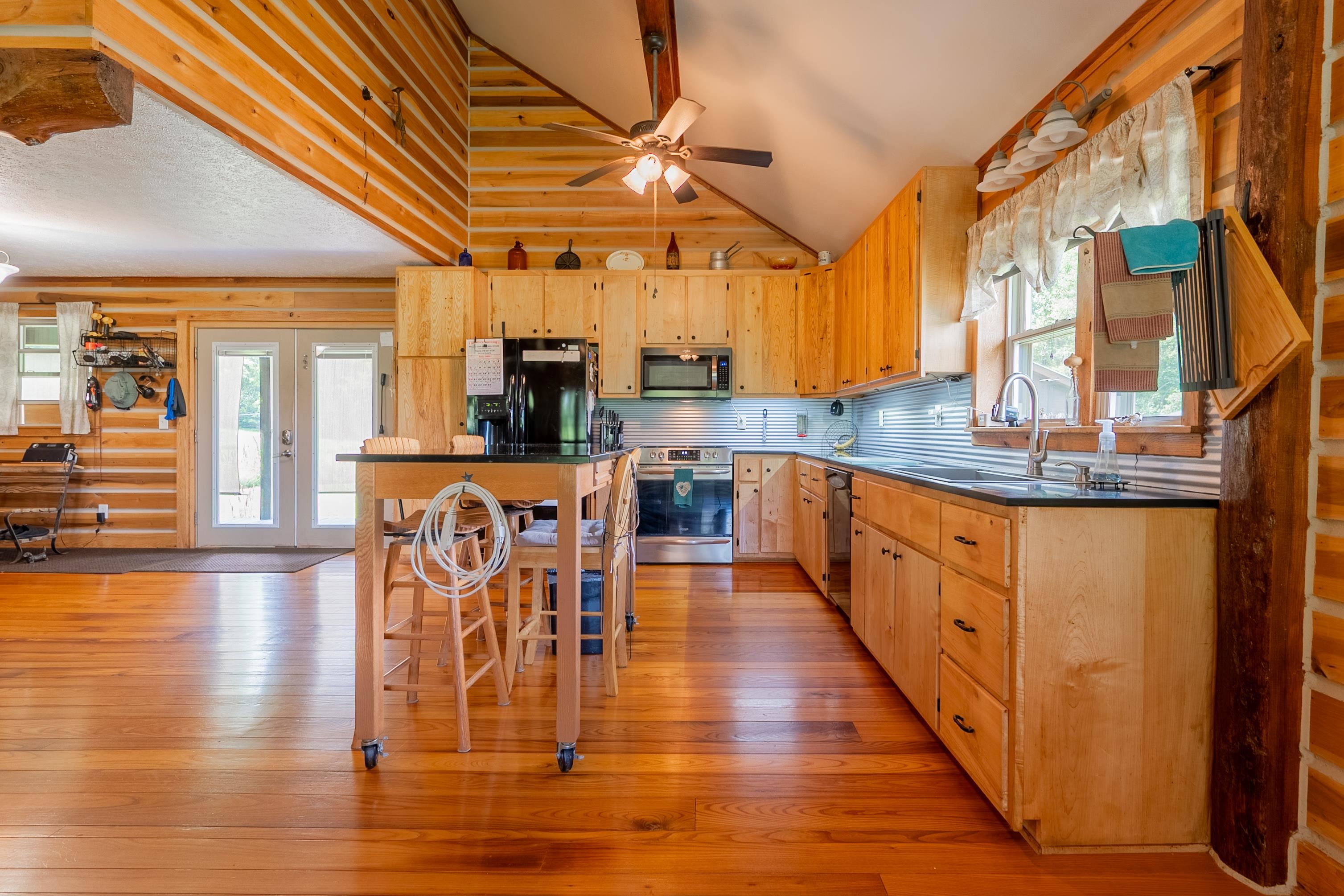 A quiet piece of paradise just off the Blue Ridge Parkway! Beautifully landscaped with flower gardens and fruit trees, this spotlessly maintained contemporary cabin offers 2,400 sq ft of living space. Handcrafted hardwood floors and unique wormy curly maple and white ash cabinetry with epoxy countertops and stainless backsplash create a truly custom kitchen. A striking stone fireplace with gas logs adds warmth to the living area. The thoughtful design incorporates the original 1940s structure into a spacious, inviting home—perfect as a family residence or vacation rental. Indulge in the luxury of a clawfoot tub and private sauna. Two detached buildings offer incredible flexibility: one functions as a radiant-heated gym/yoga studio with a peaceful deck, while the other houses a woodworking shop and lower-level workspace. A side structure provides extra storage for tools. Come experience this tranquil, one-of-a-kind mountain retreat!