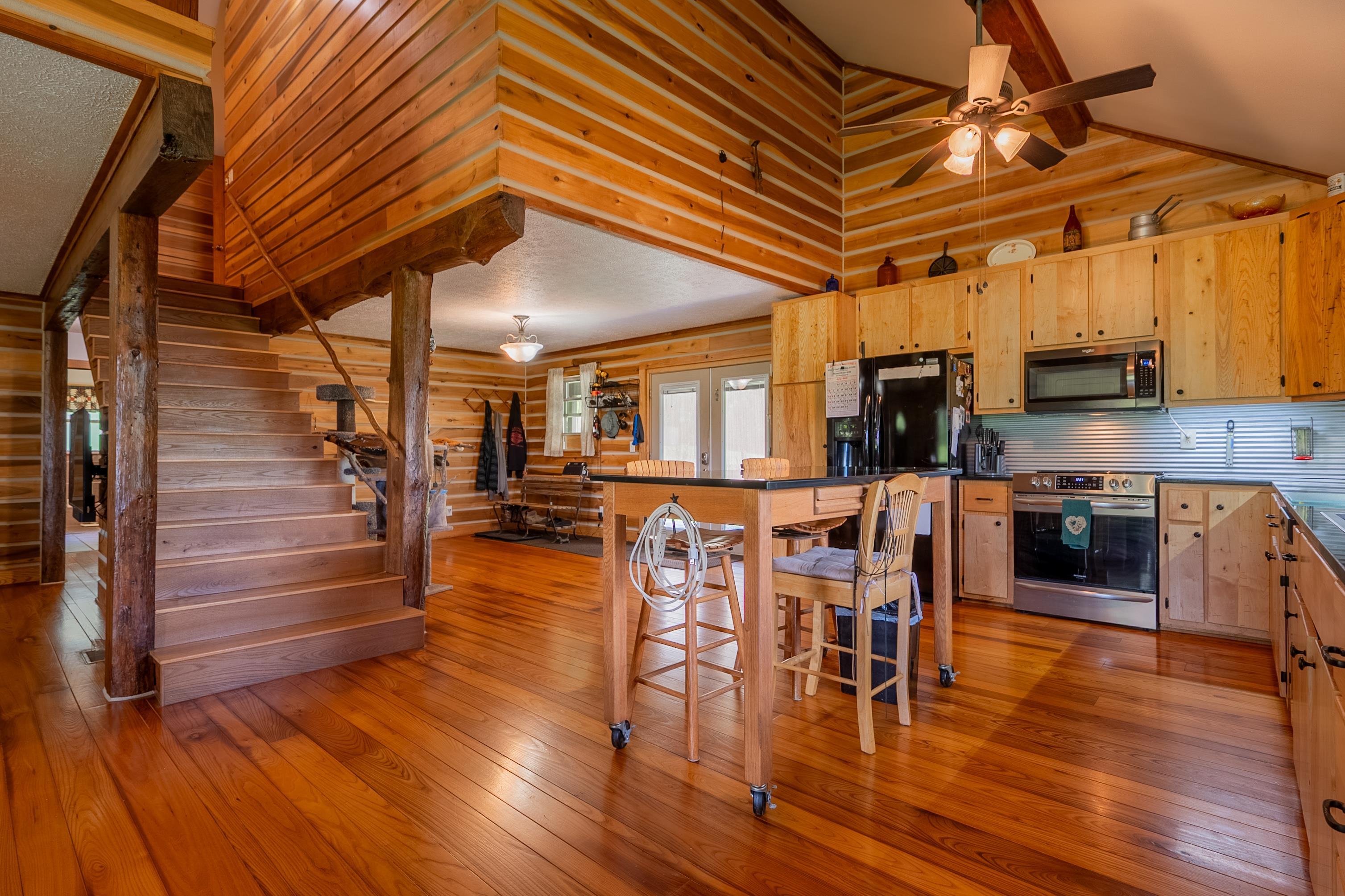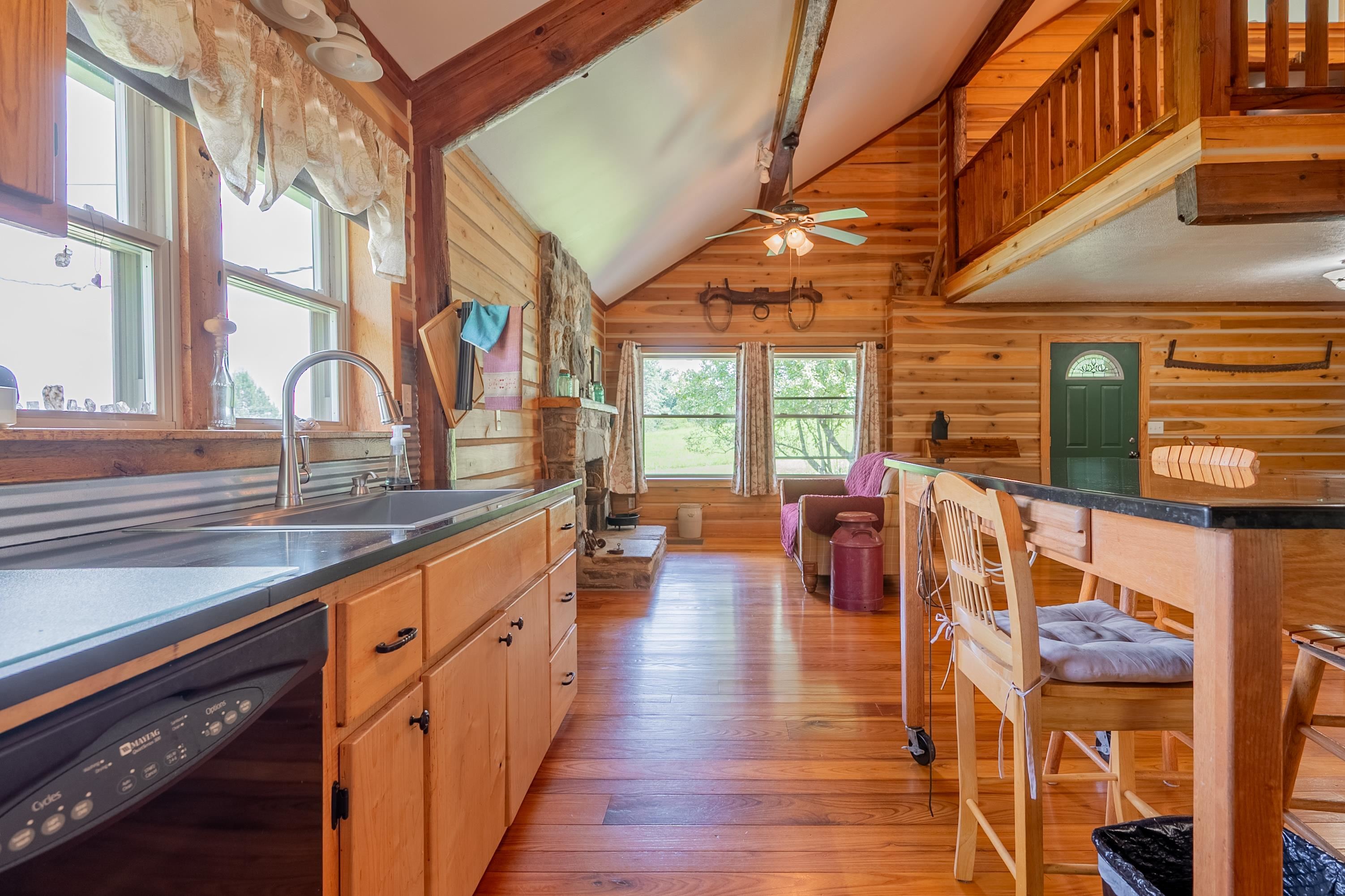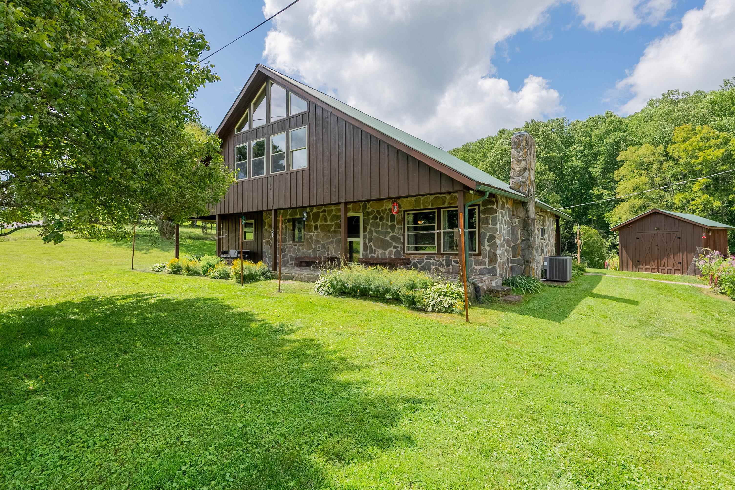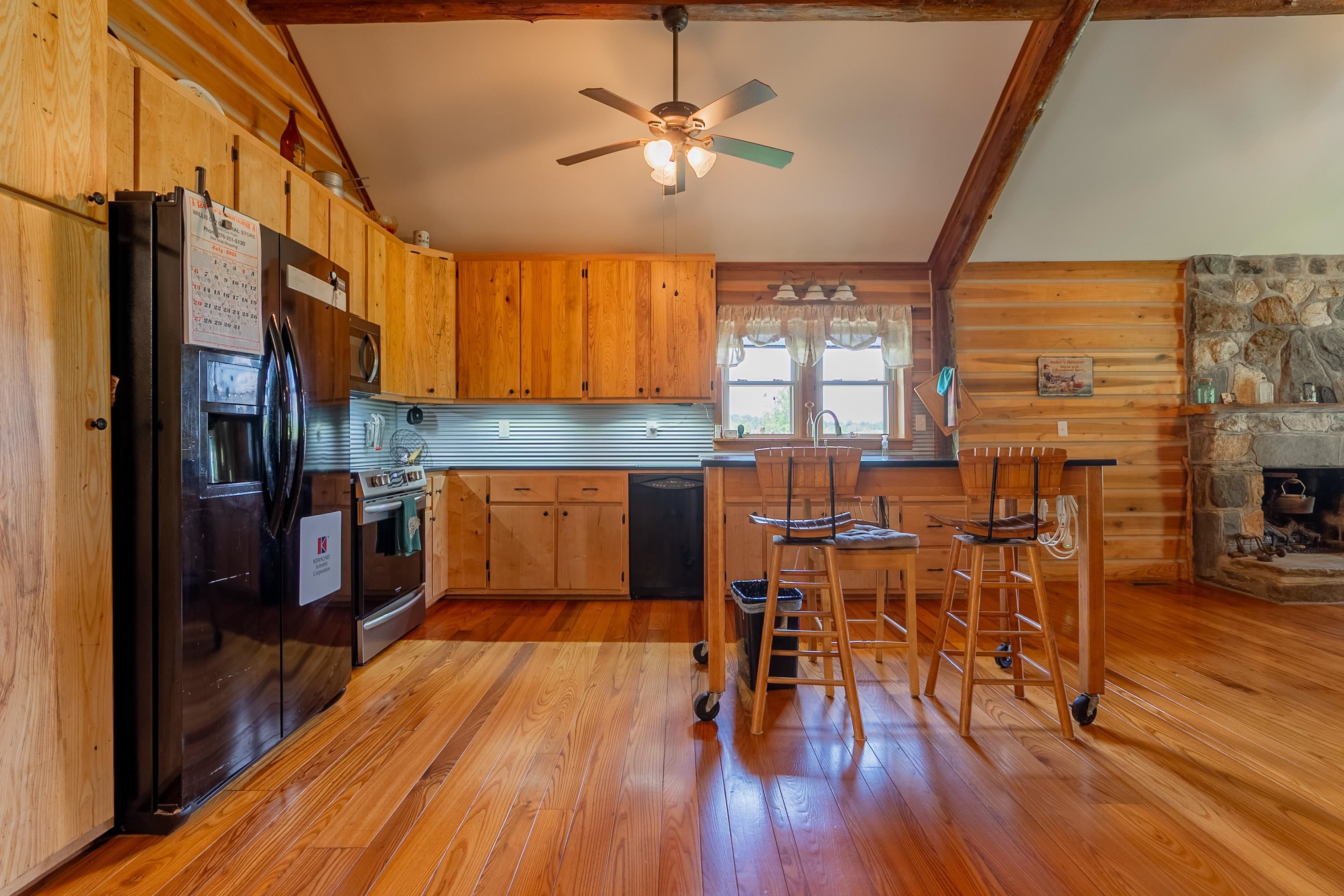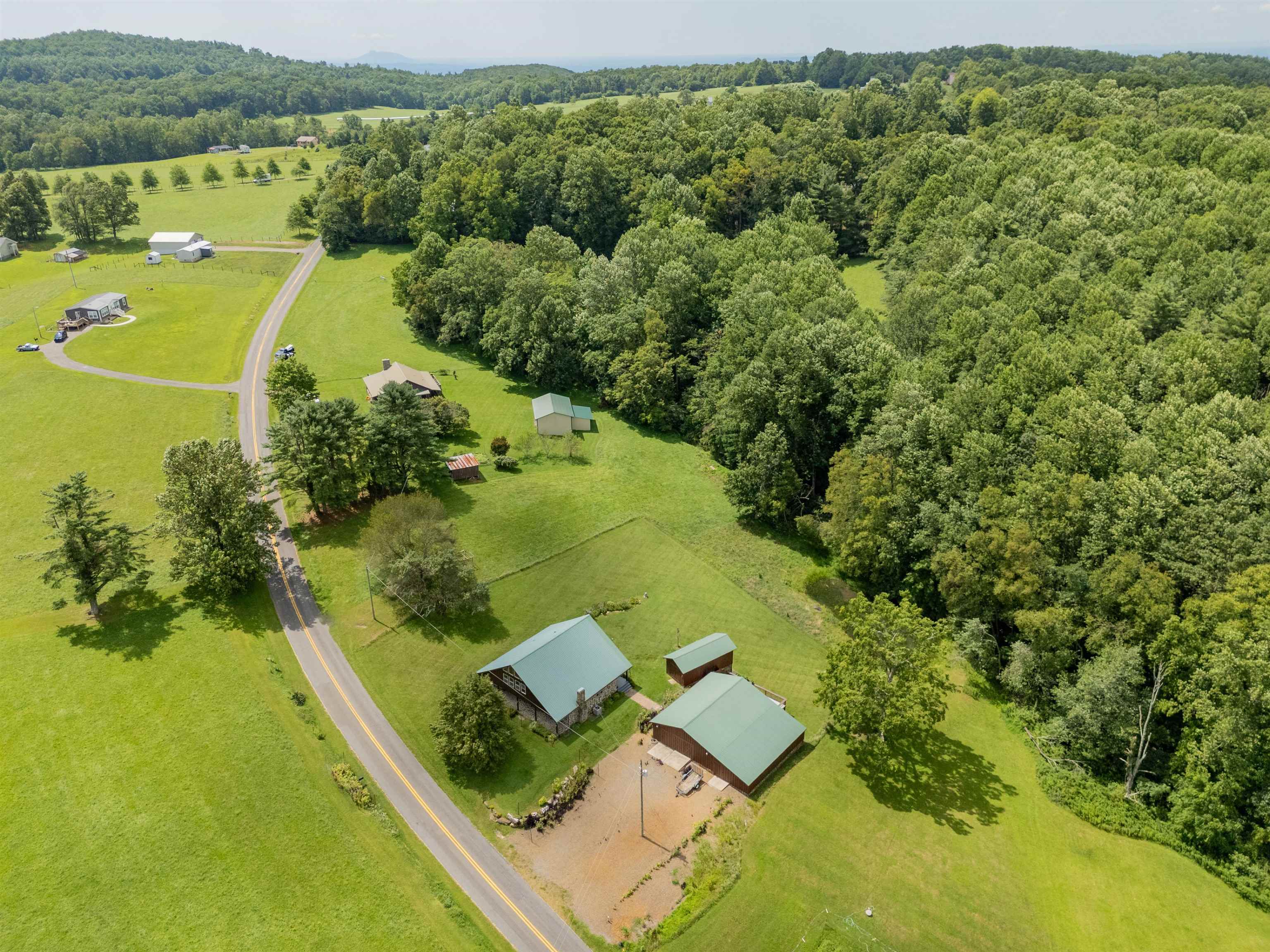 A quiet piece of paradise just off the Blue Ridge Parkway! Beautifully landscaped with flower gardens and fruit trees, this spotlessly maintained contemporary cabin offers 2,400 sq ft of living space. Handcrafted hardwood floors and unique wormy curly maple and white ash cabinetry with epoxy countertops and stainless backsplash create a truly custom kitchen. A striking stone fireplace with gas logs adds warmth to the living area. The thoughtful design incorporates the original 1940s structure into a spacious, inviting home—perfect as a family residence or vacation rental. Indulge in the luxury of a clawfoot tub and private sauna. Two detached buildings offer incredible flexibility: one functions as a radiant-heated gym/yoga studio with a peaceful deck, while the other houses a woodworking shop and lower-level workspace. A side structure provides extra storage for tools. Come experience this tranquil, one-of-a-kind mountain retreat!
