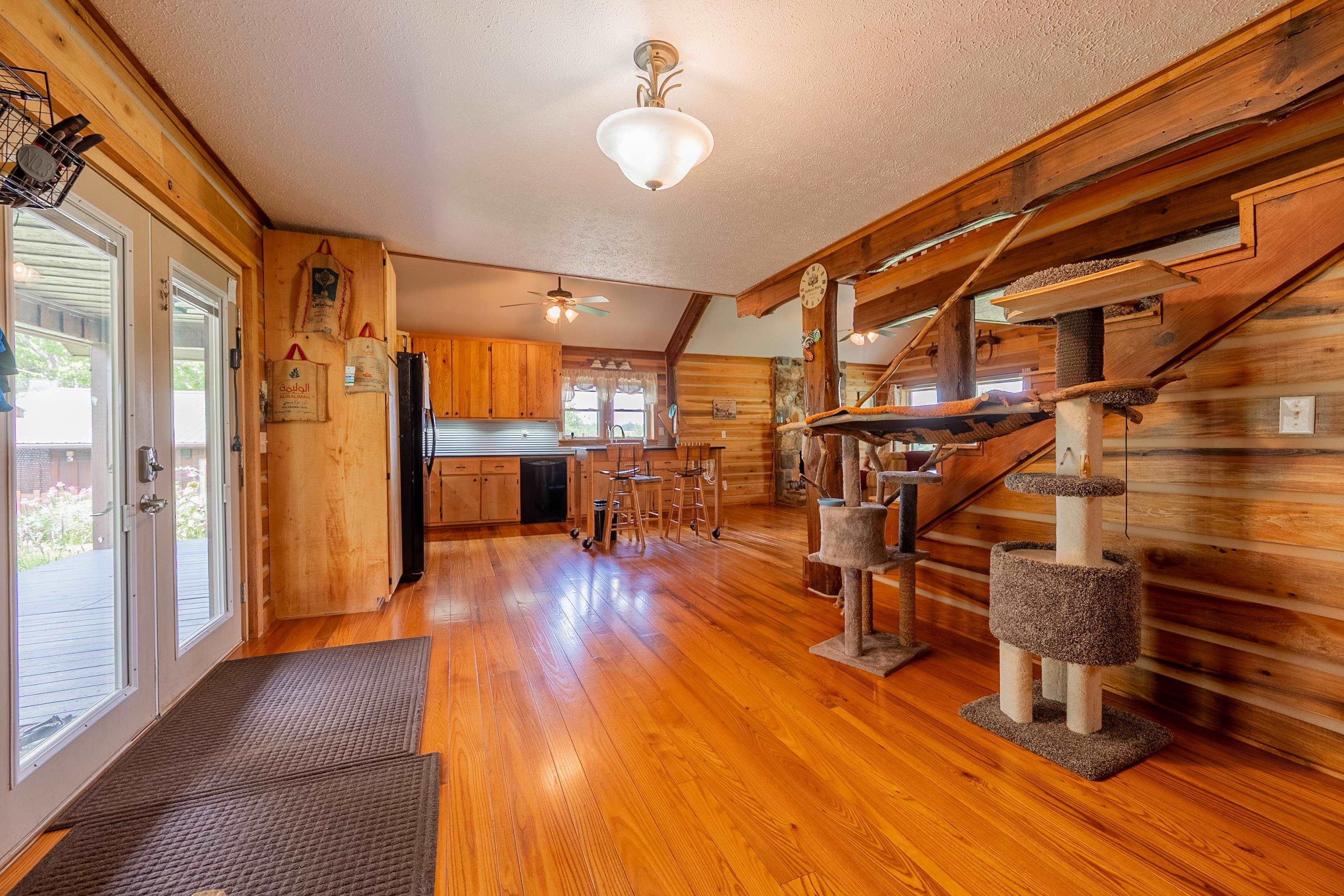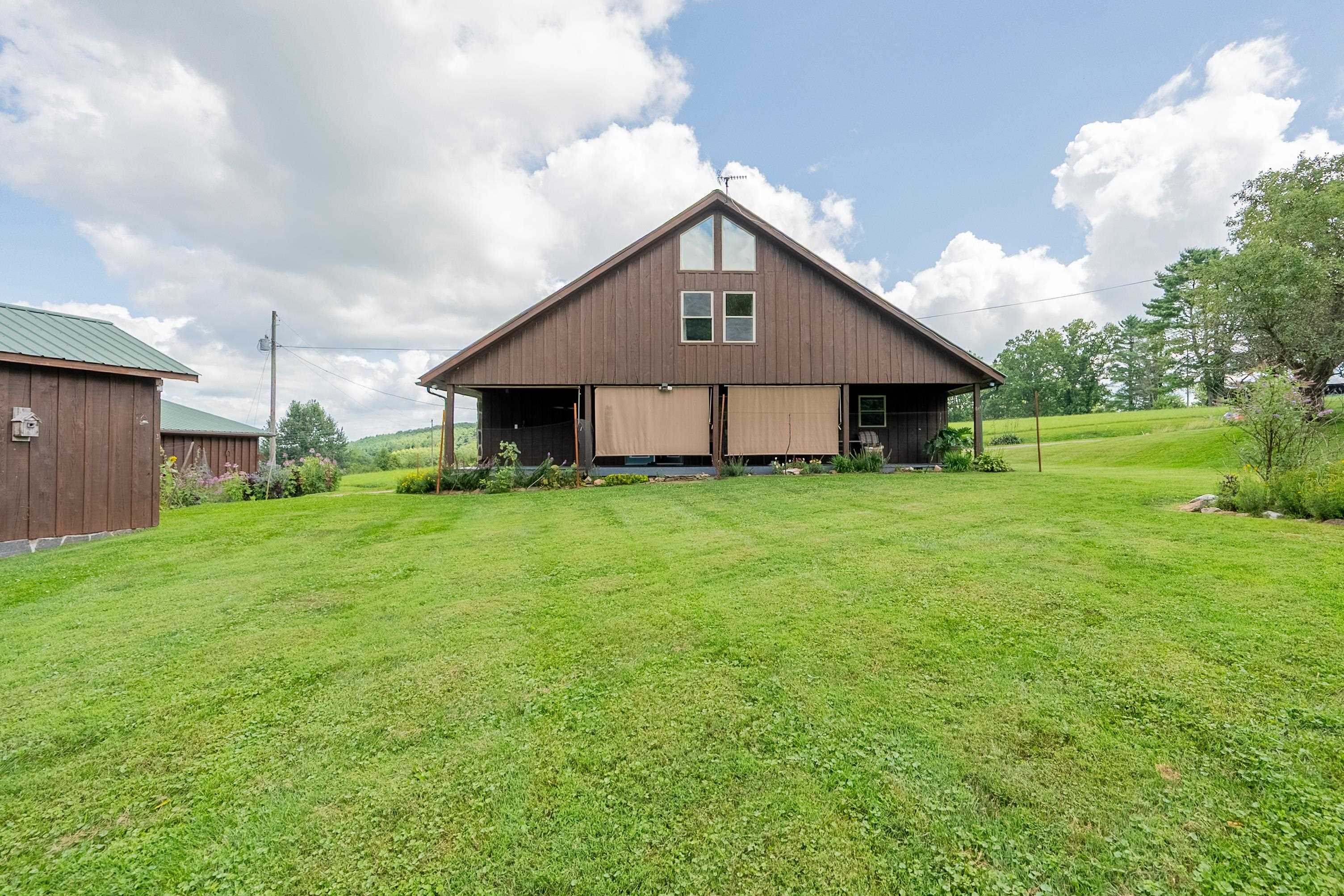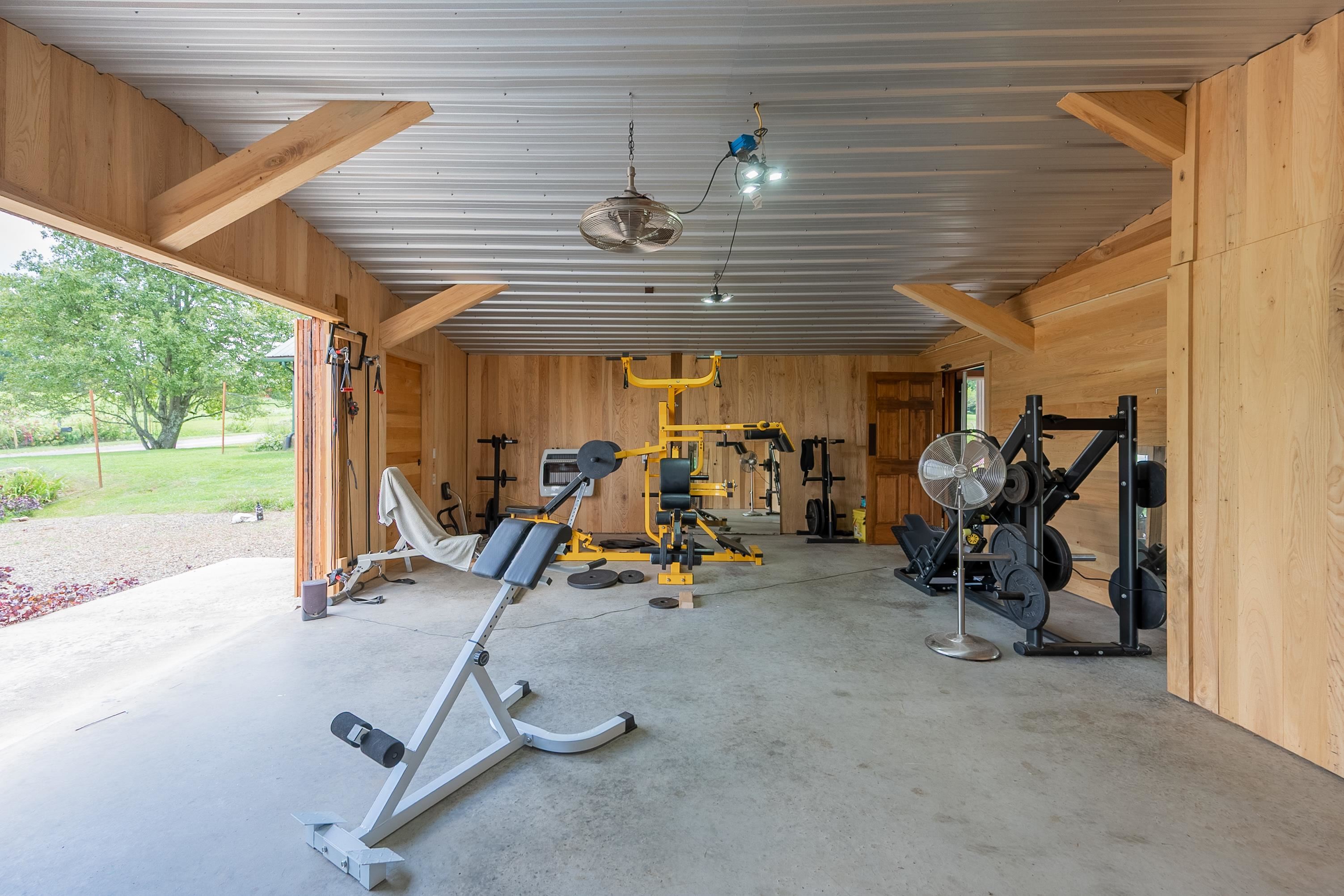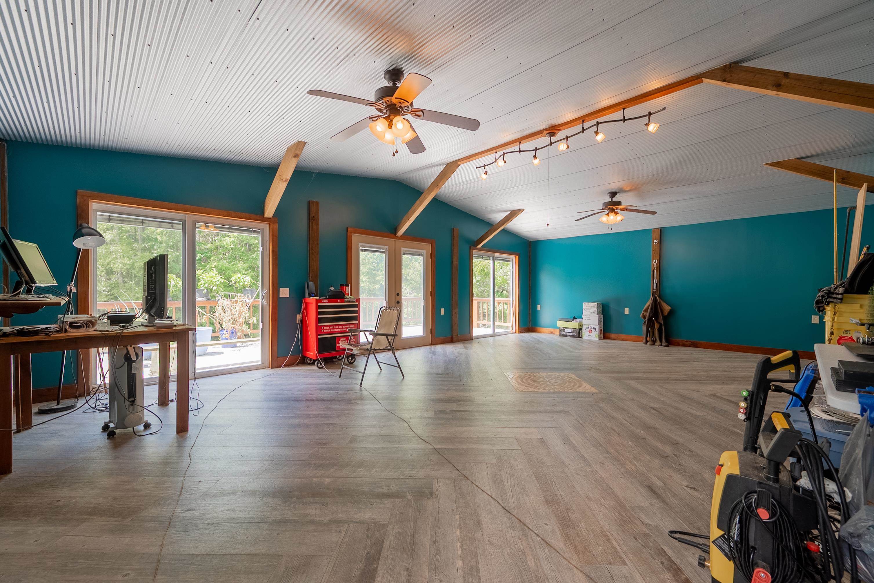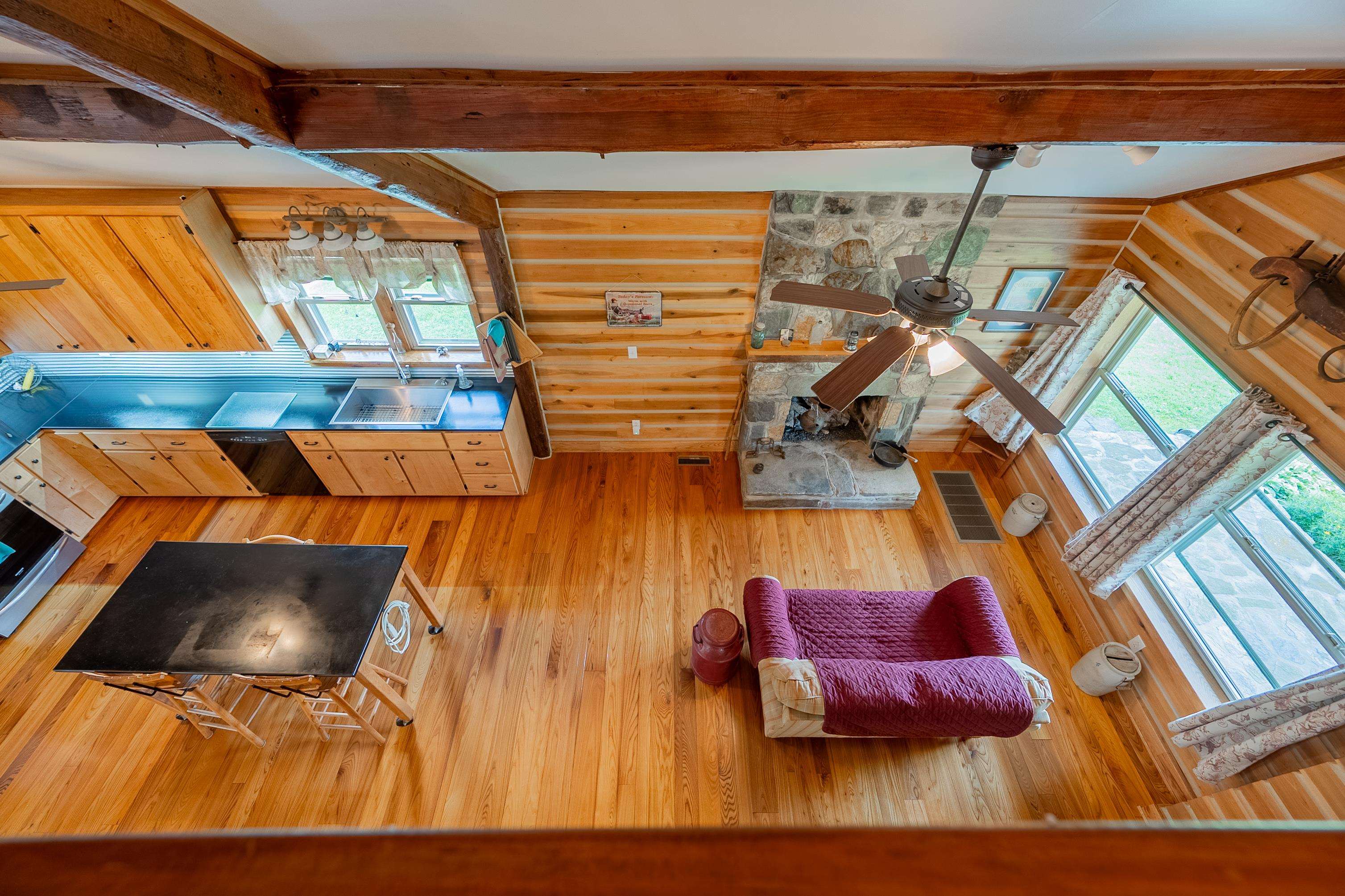 A quiet piece of paradise just off the Blue Ridge Parkway! Beautifully landscaped with flower gardens and fruit trees, this spotlessly maintained contemporary cabin offers 2,400 sq ft of living space. Handcrafted hardwood floors and unique wormy curly maple and white ash cabinetry with epoxy countertops and stainless backsplash create a truly custom kitchen. A striking stone fireplace with gas logs adds warmth to the living area. The thoughtful design incorporates the original 1940s structure into a spacious, inviting home—perfect as a family residence or vacation rental. Indulge in the luxury of a clawfoot tub and private sauna. Two detached buildings offer incredible flexibility: one functions as a radiant-heated gym/yoga studio with a peaceful deck, while the other houses a woodworking shop and lower-level workspace. A side structure provides extra storage for tools. Come experience this tranquil, one-of-a-kind mountain retreat!