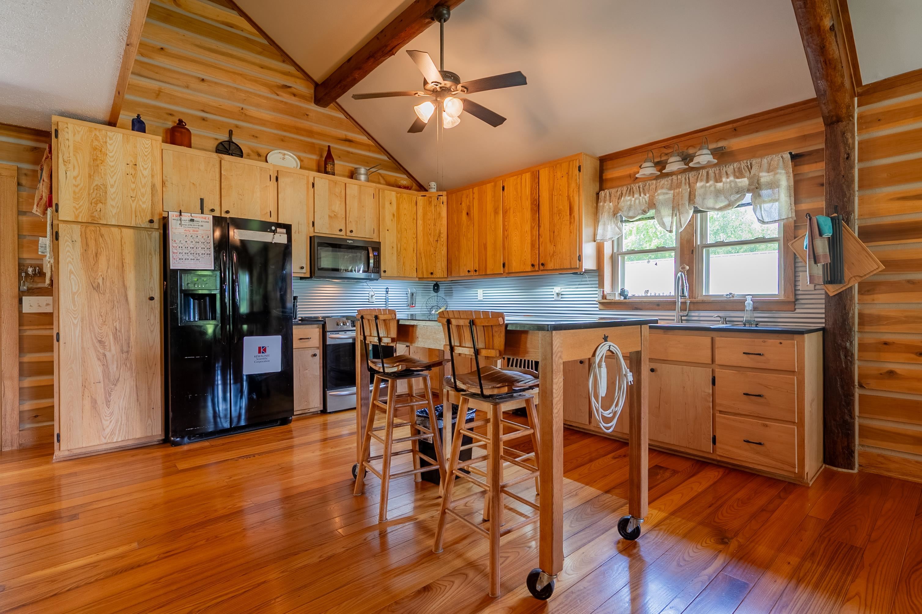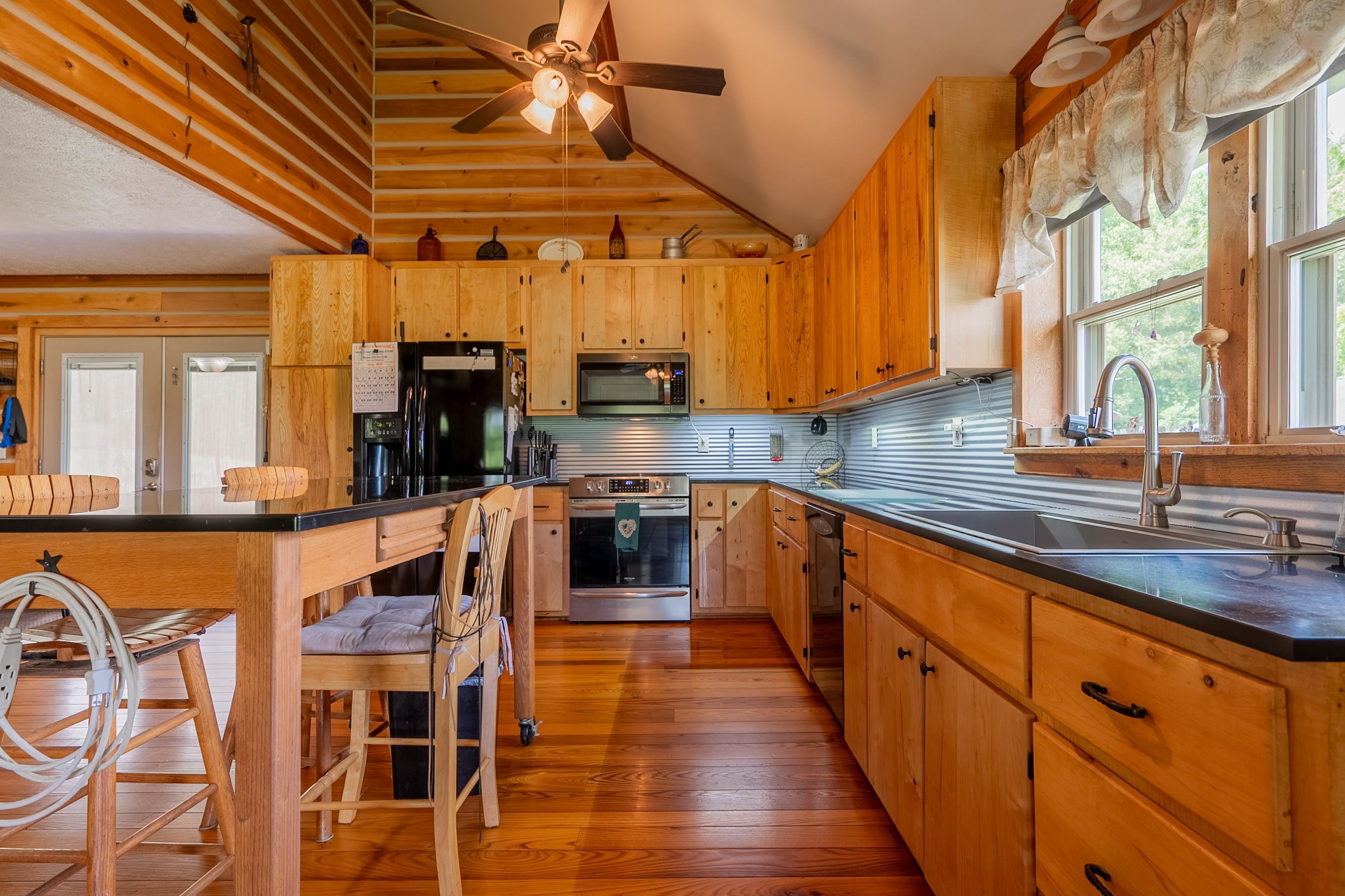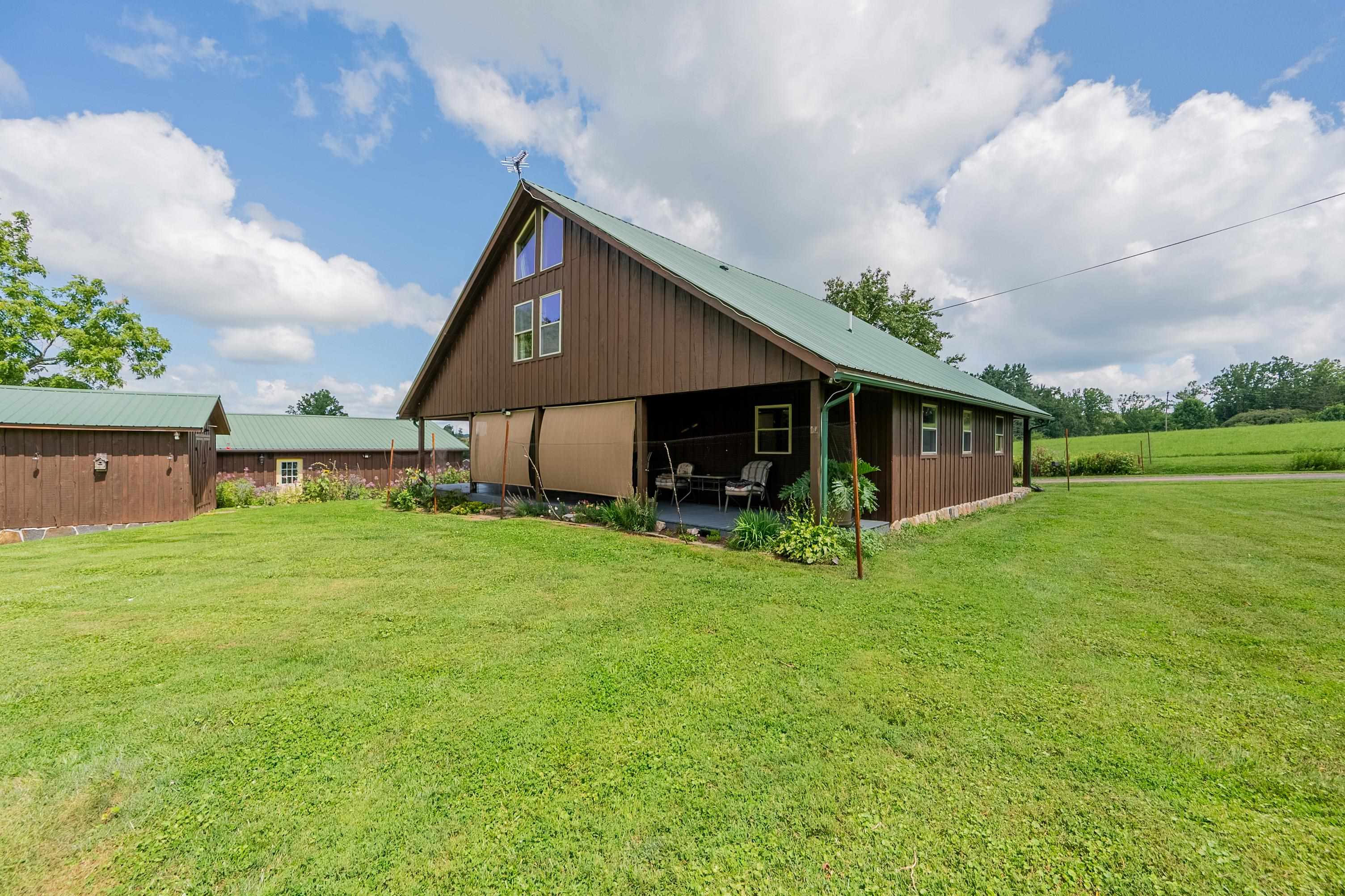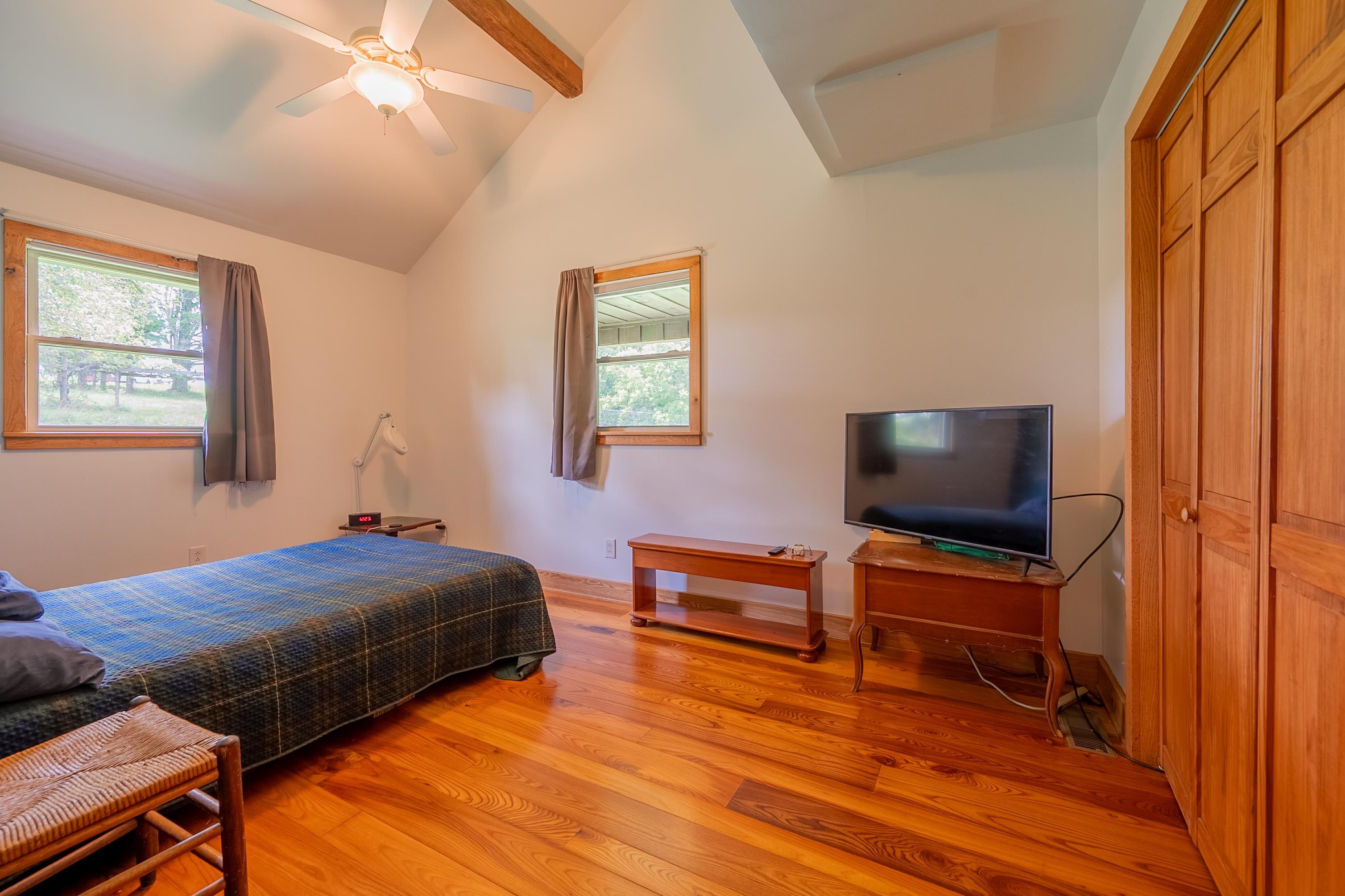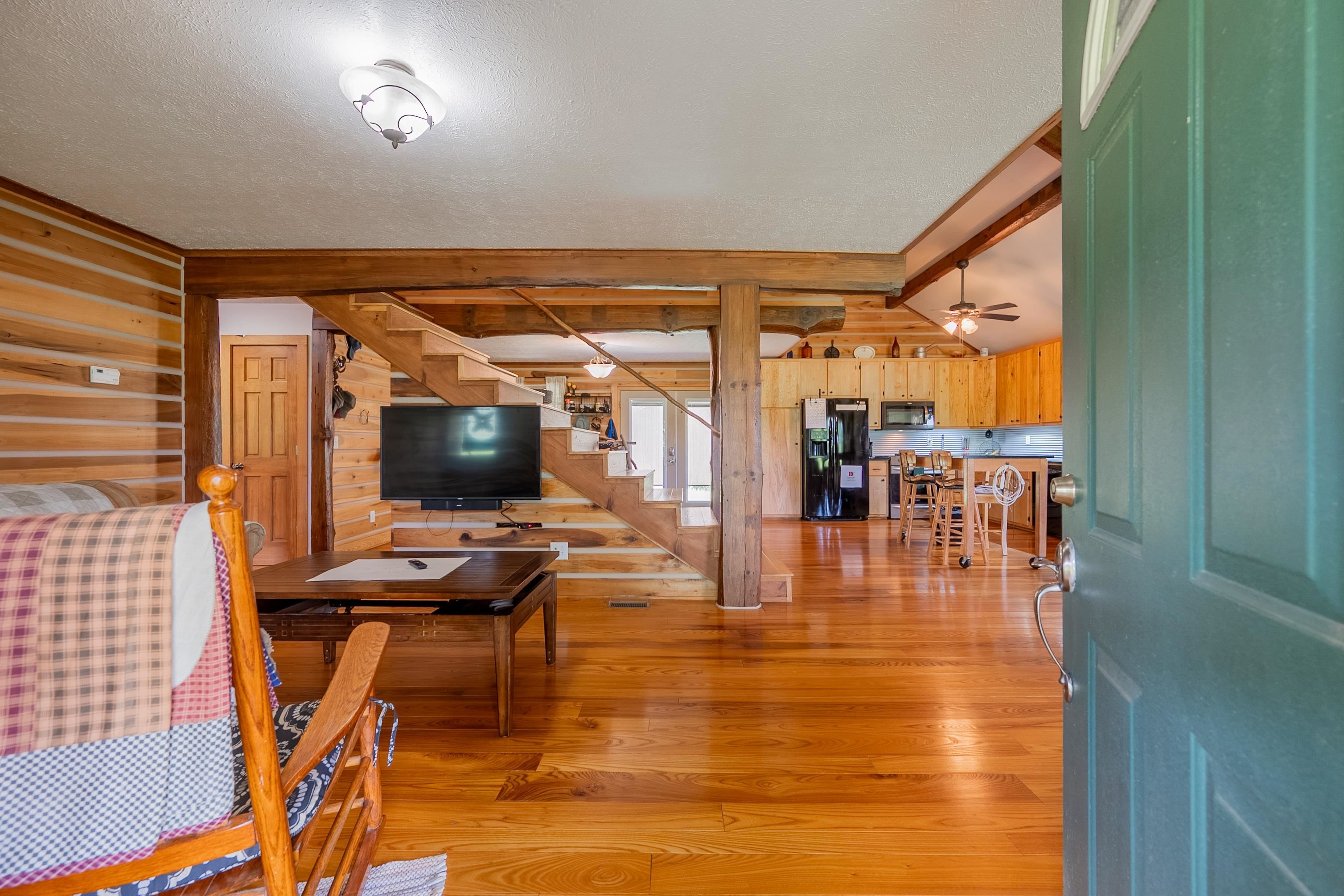 A quiet piece of paradise just off the Blue Ridge Parkway! Beautifully landscaped with flower gardens and fruit trees, this spotlessly maintained contemporary cabin offers 2,400 sq ft of living space. Handcrafted hardwood floors and unique wormy curly maple and white ash cabinetry with epoxy countertops and stainless backsplash create a truly custom kitchen. A striking stone fireplace with gas logs adds warmth to the living area. The thoughtful design incorporates the original 1940s structure into a spacious, inviting home—perfect as a family residence or vacation rental. Indulge in the luxury of a clawfoot tub and private sauna. Two detached buildings offer incredible flexibility: one functions as a radiant-heated gym/yoga studio with a peaceful deck, while the other houses a woodworking shop and lower-level workspace. A side structure provides extra storage for tools. Come experience this tranquil, one-of-a-kind mountain retreat!