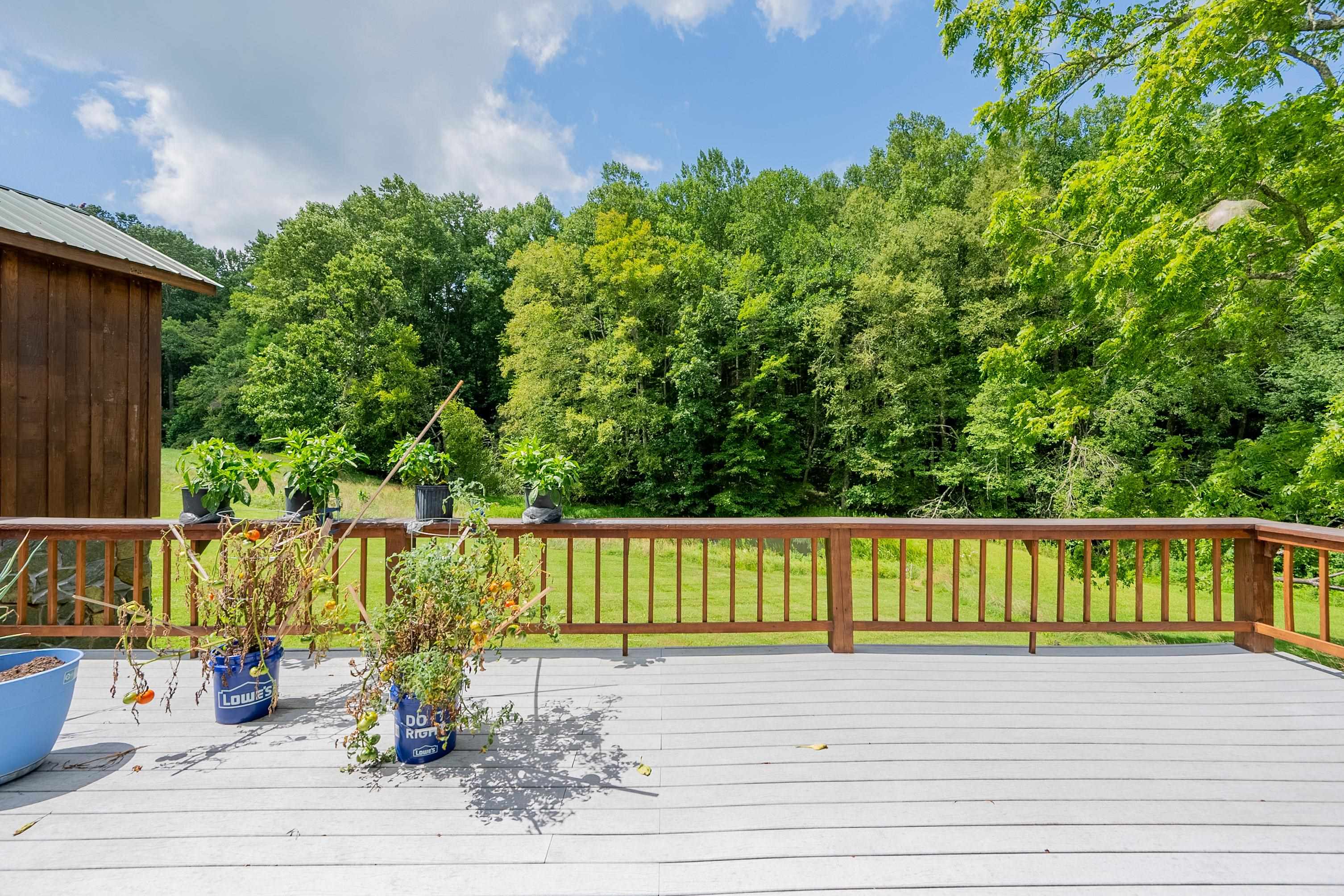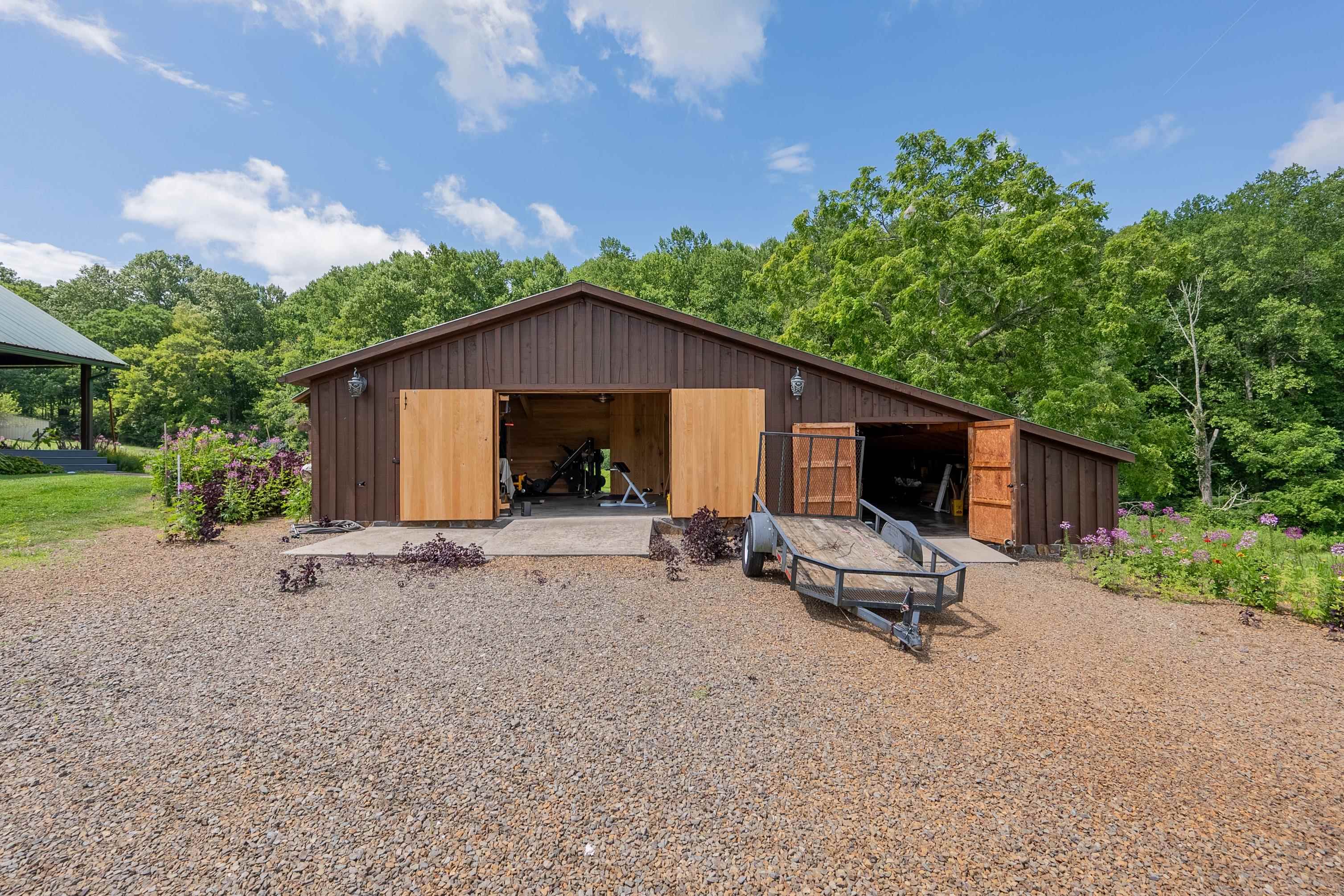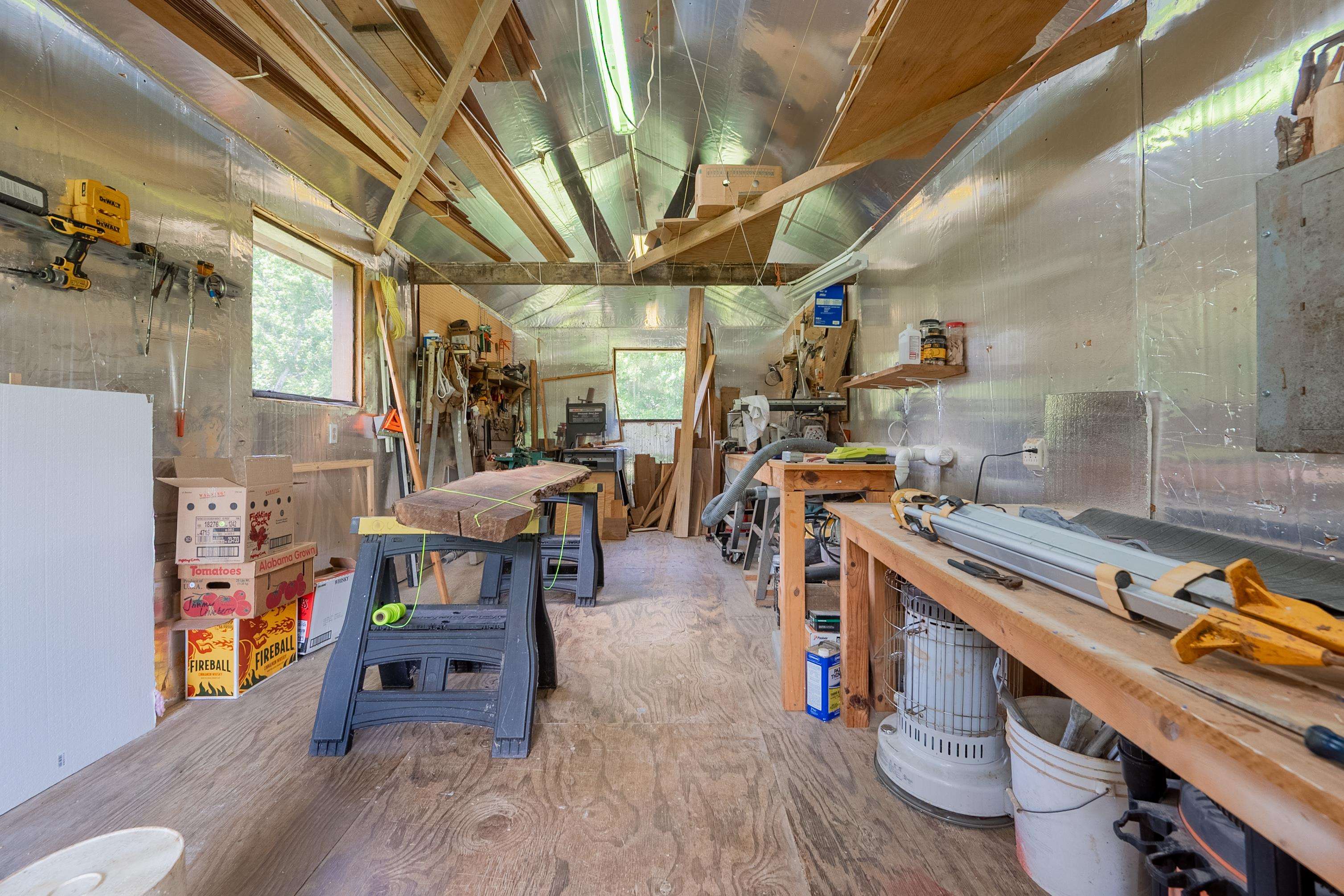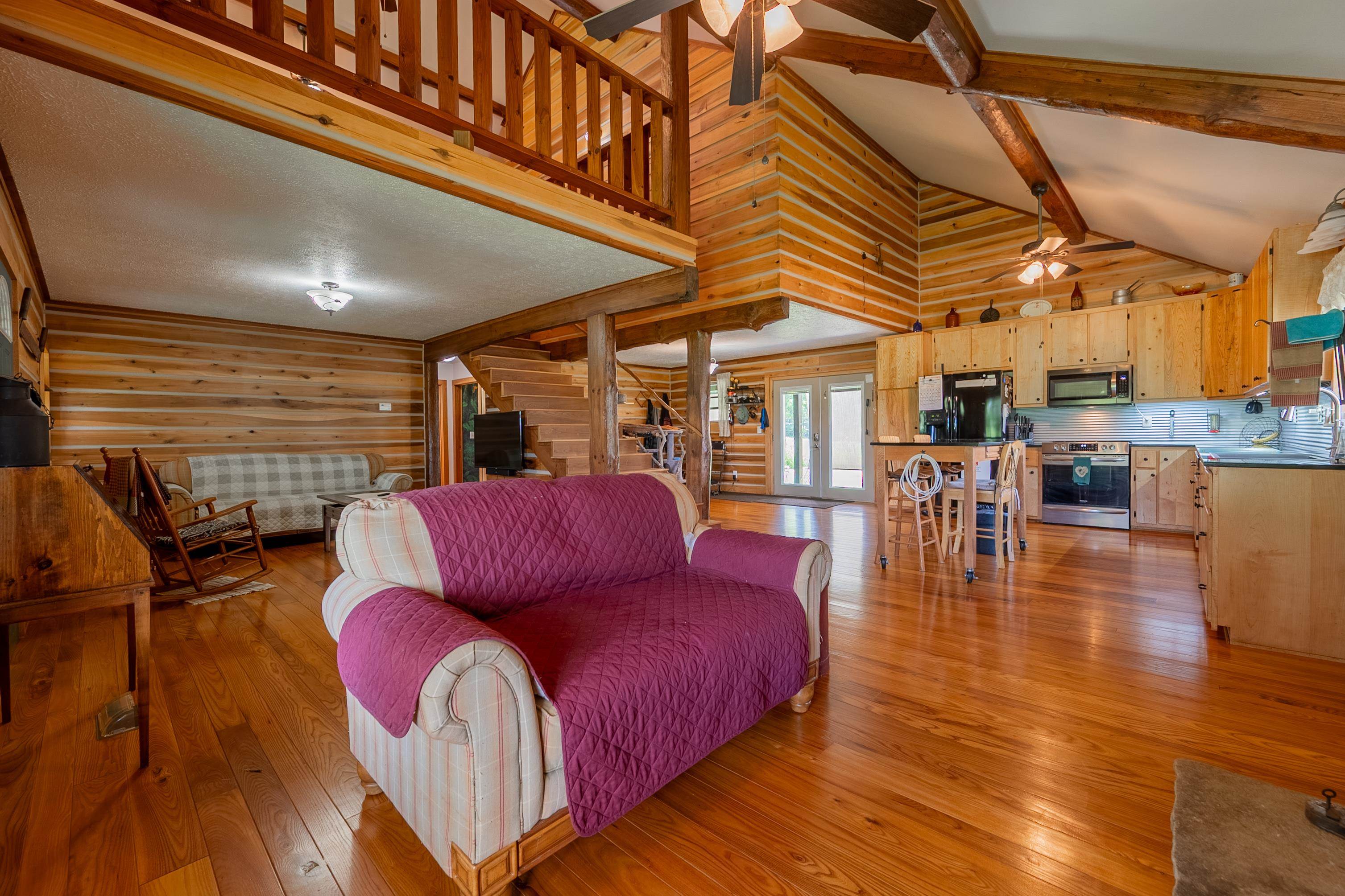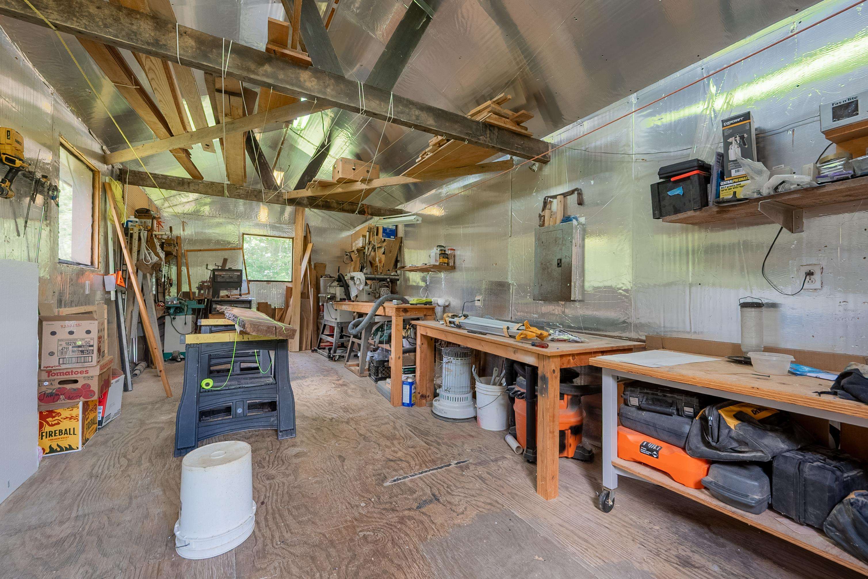 A quiet piece of paradise just off the Blue Ridge Parkway! Beautifully landscaped with flower gardens and fruit trees, this spotlessly maintained contemporary cabin offers 2,400 sq ft of living space. Handcrafted hardwood floors and unique wormy curly maple and white ash cabinetry with epoxy countertops and stainless backsplash create a truly custom kitchen. A striking stone fireplace with gas logs adds warmth to the living area. The thoughtful design incorporates the original 1940s structure into a spacious, inviting home—perfect as a family residence or vacation rental. Indulge in the luxury of a clawfoot tub and private sauna. Two detached buildings offer incredible flexibility: one functions as a radiant-heated gym/yoga studio with a peaceful deck, while the other houses a woodworking shop and lower-level workspace. A side structure provides extra storage for tools. Come experience this tranquil, one-of-a-kind mountain retreat!