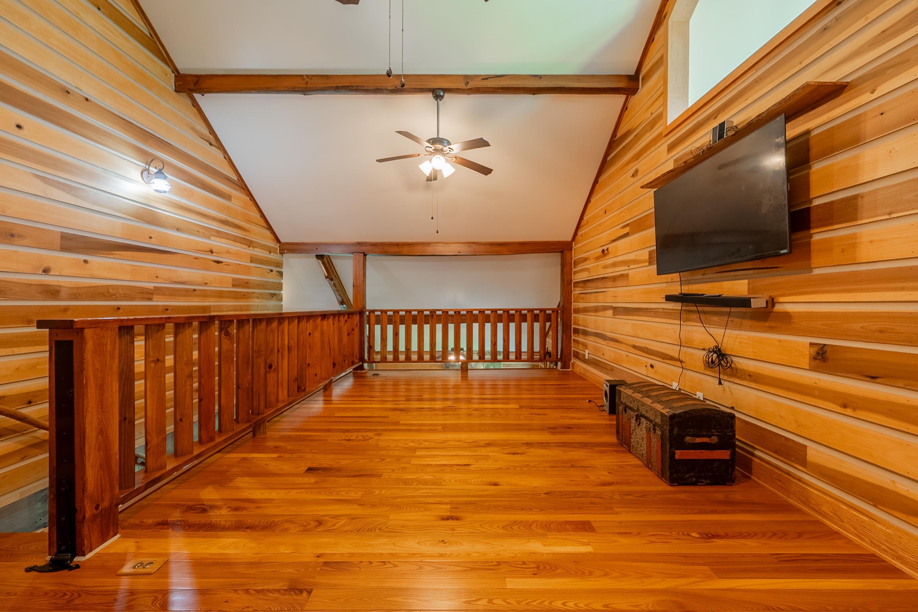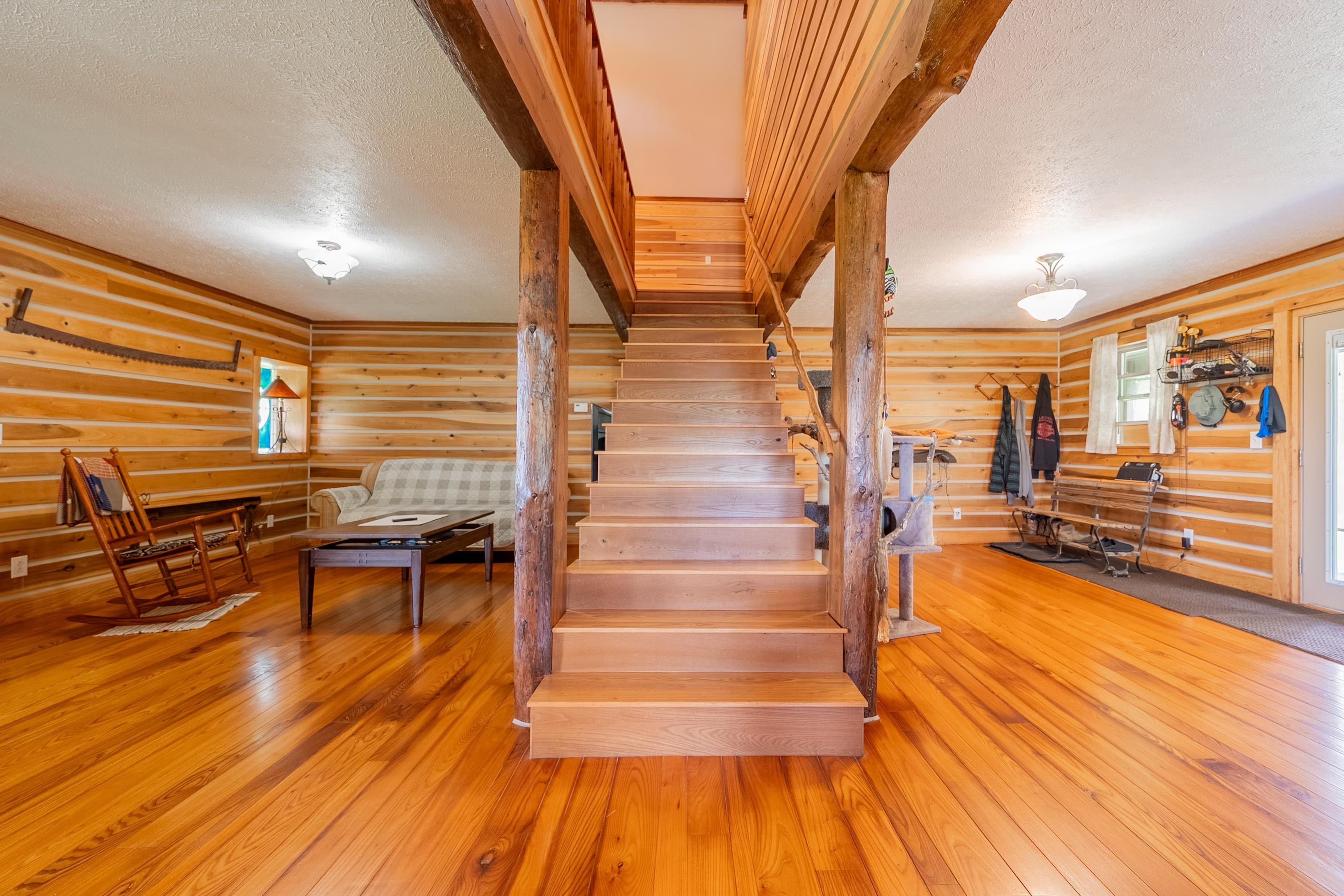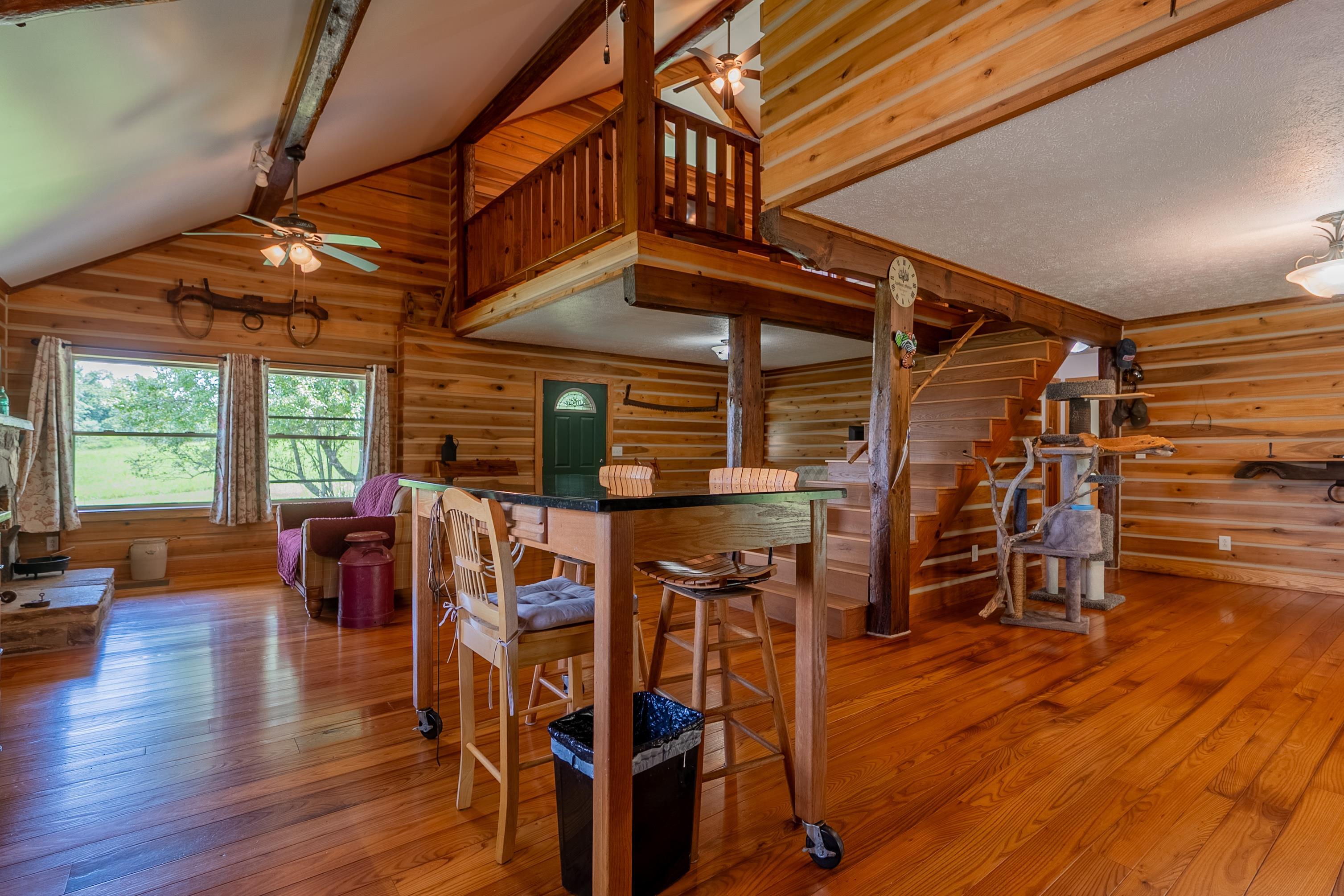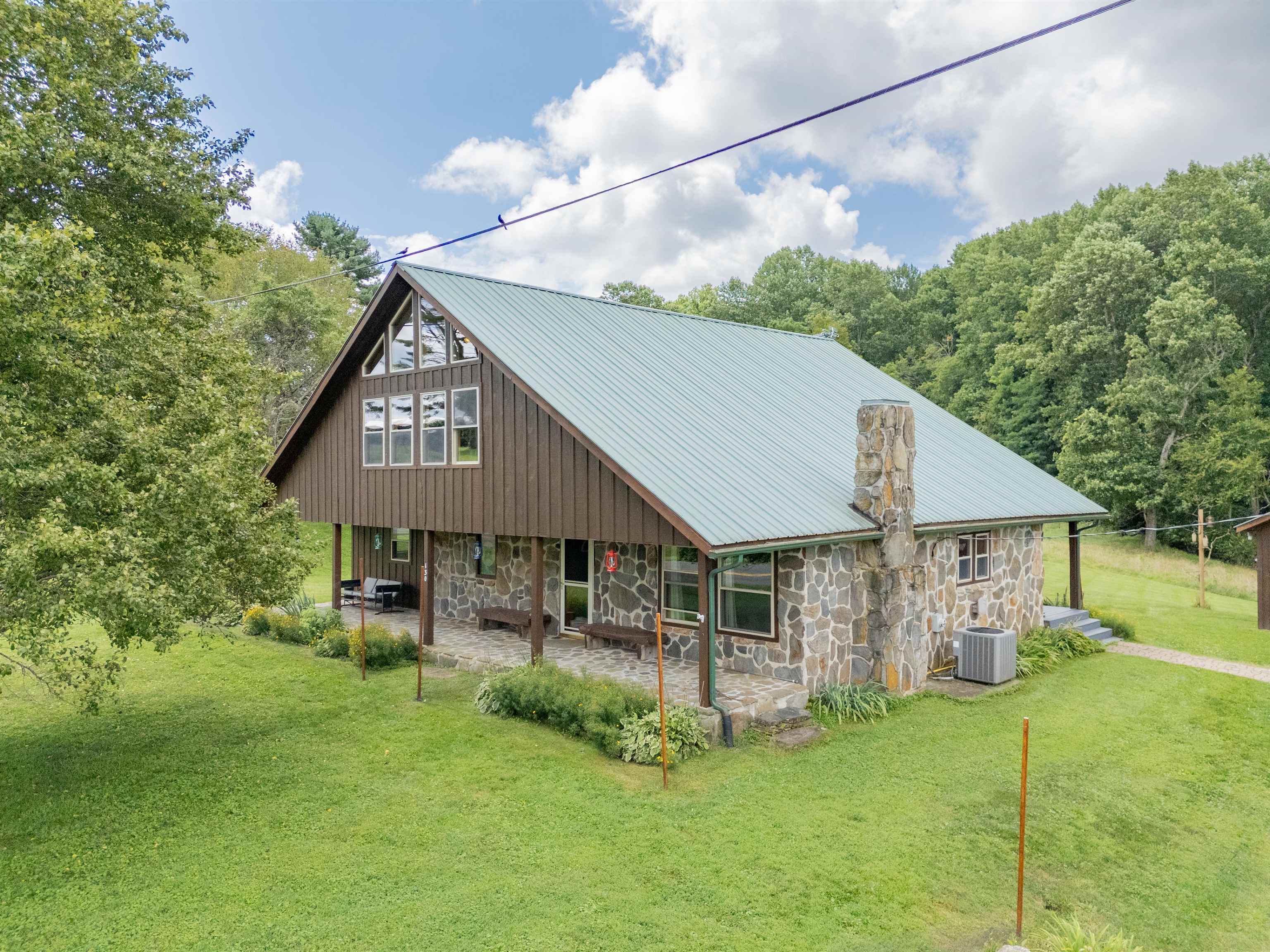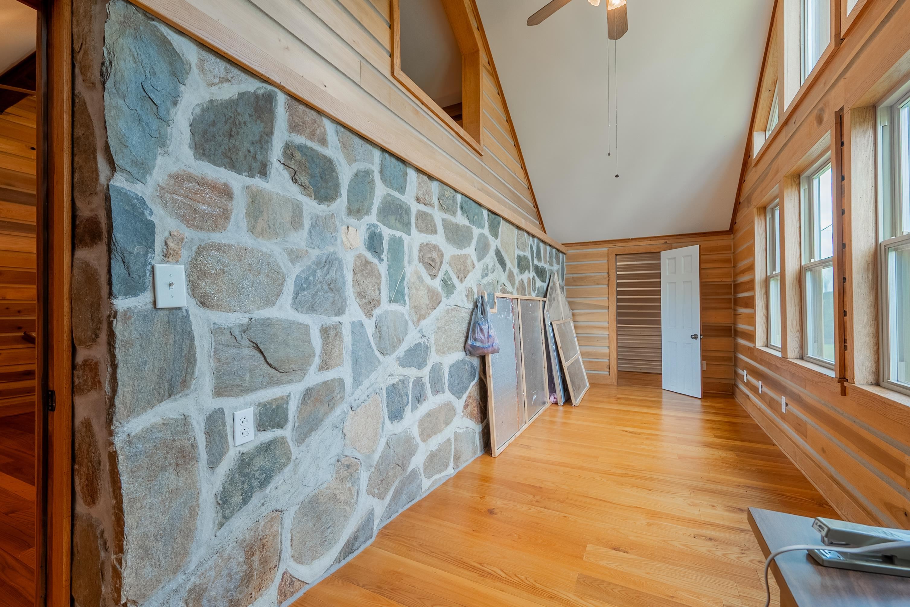 A quiet piece of paradise just off the Blue Ridge Parkway! Beautifully landscaped with flower gardens and fruit trees, this spotlessly maintained contemporary cabin offers 2,400 sq ft of living space. Handcrafted hardwood floors and unique wormy curly maple and white ash cabinetry with epoxy countertops and stainless backsplash create a truly custom kitchen. A striking stone fireplace with gas logs adds warmth to the living area. The thoughtful design incorporates the original 1940s structure into a spacious, inviting home—perfect as a family residence or vacation rental. Indulge in the luxury of a clawfoot tub and private sauna. Two detached buildings offer incredible flexibility: one functions as a radiant-heated gym/yoga studio with a peaceful deck, while the other houses a woodworking shop and lower-level workspace. A side structure provides extra storage for tools. Come experience this tranquil, one-of-a-kind mountain retreat!