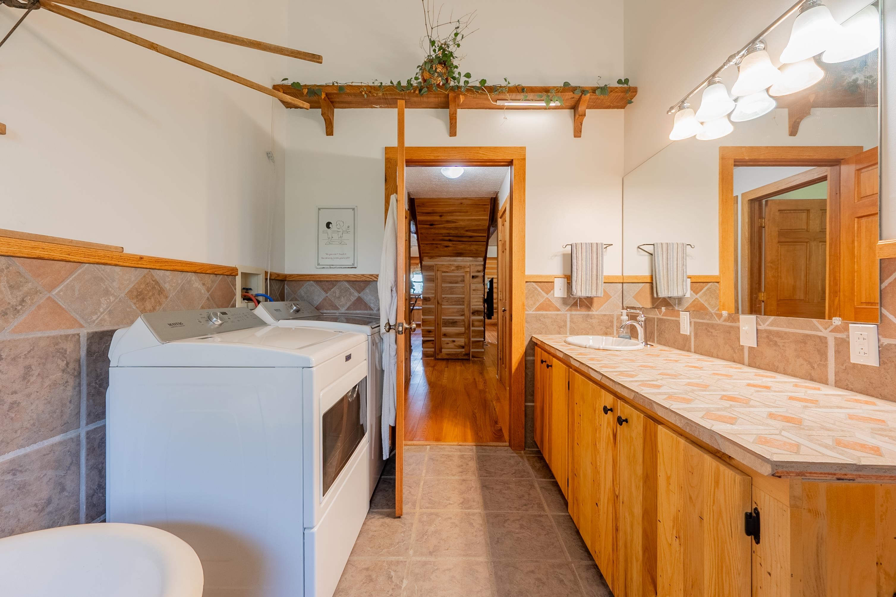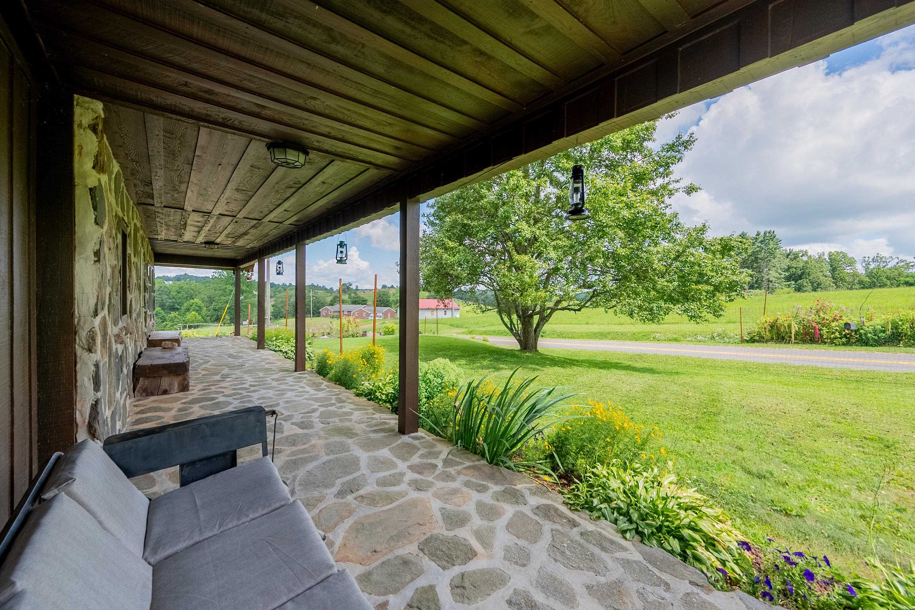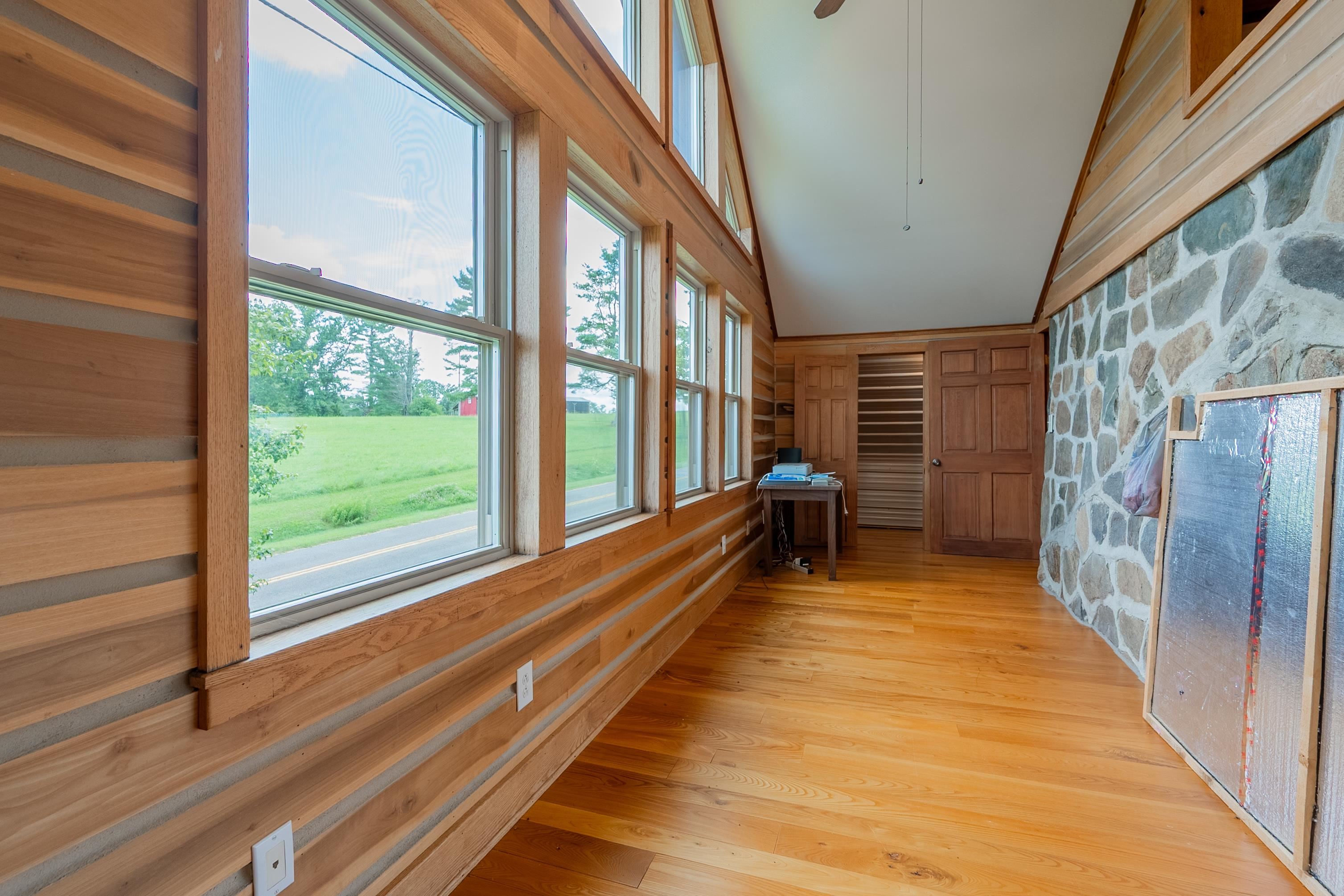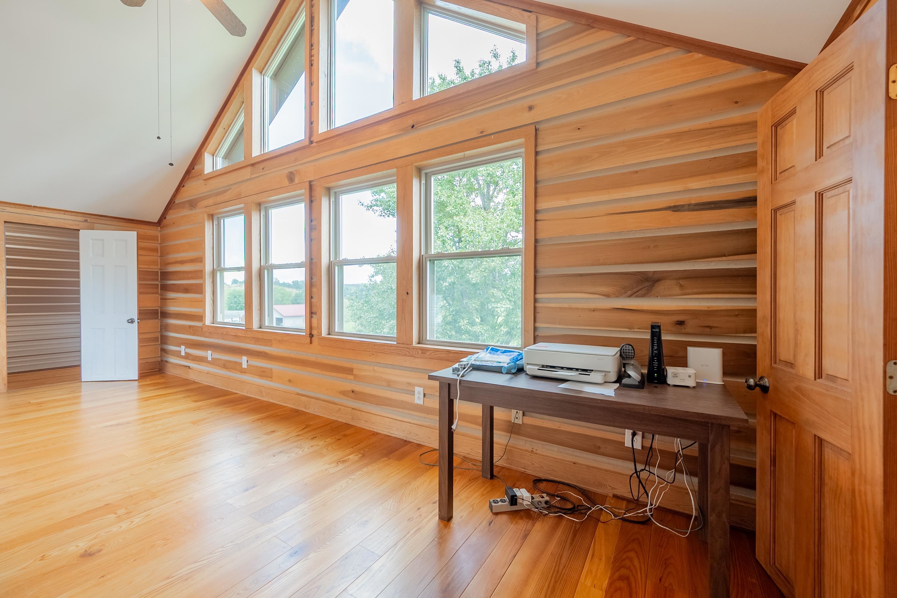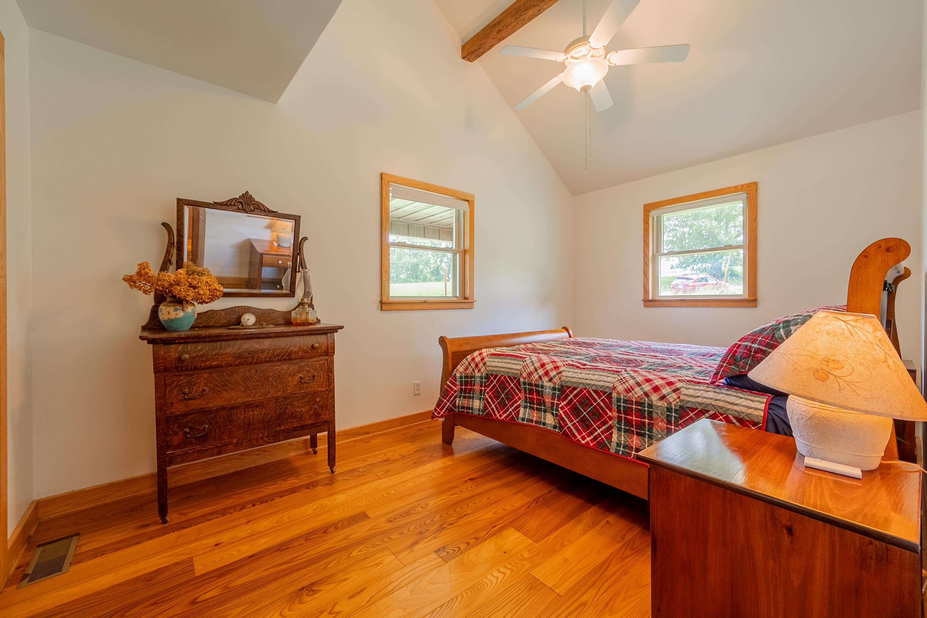 A quiet piece of paradise just off the Blue Ridge Parkway! Beautifully landscaped with flower gardens and fruit trees, this spotlessly maintained contemporary cabin offers 2,400 sq ft of living space. Handcrafted hardwood floors and unique wormy curly maple and white ash cabinetry with epoxy countertops and stainless backsplash create a truly custom kitchen. A striking stone fireplace with gas logs adds warmth to the living area. The thoughtful design incorporates the original 1940s structure into a spacious, inviting home—perfect as a family residence or vacation rental. Indulge in the luxury of a clawfoot tub and private sauna. Two detached buildings offer incredible flexibility: one functions as a radiant-heated gym/yoga studio with a peaceful deck, while the other houses a woodworking shop and lower-level workspace. A side structure provides extra storage for tools. Come experience this tranquil, one-of-a-kind mountain retreat!