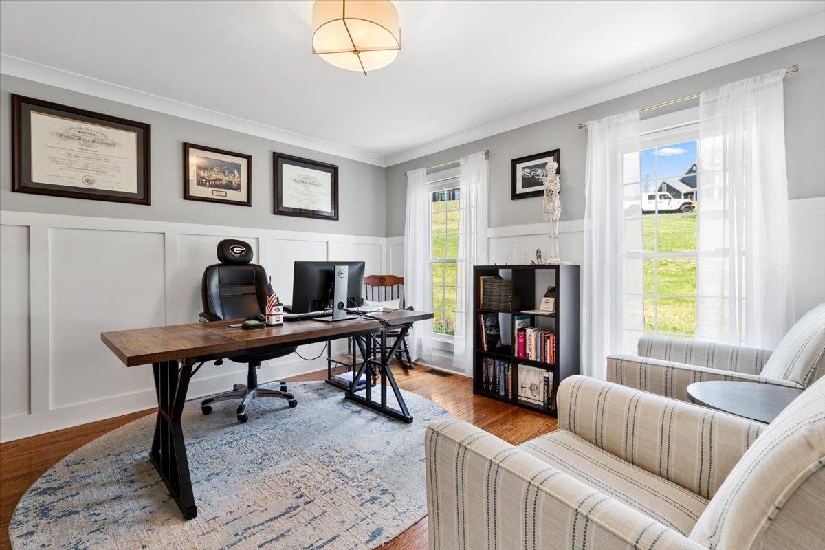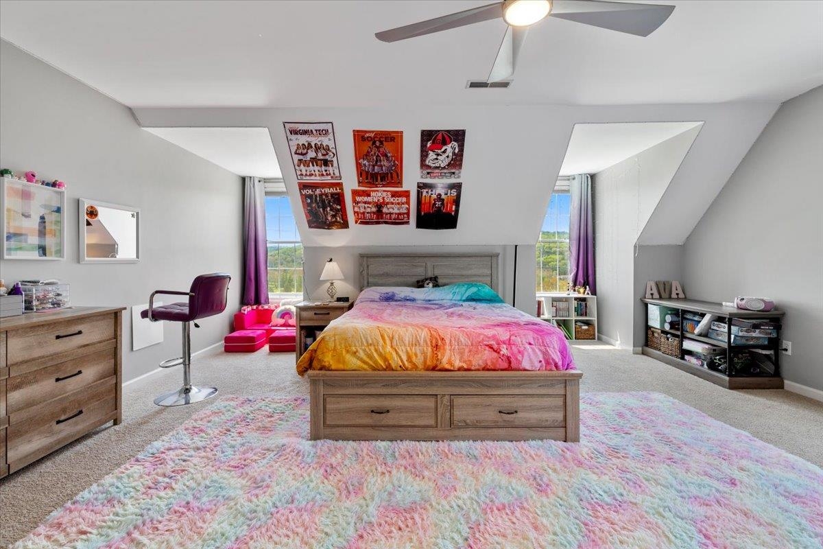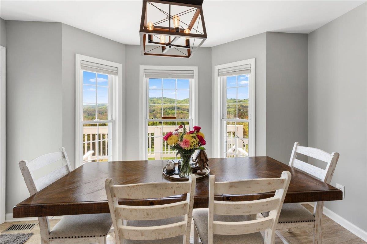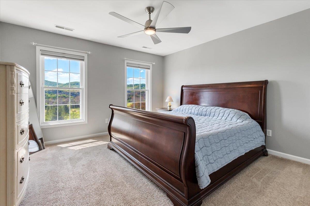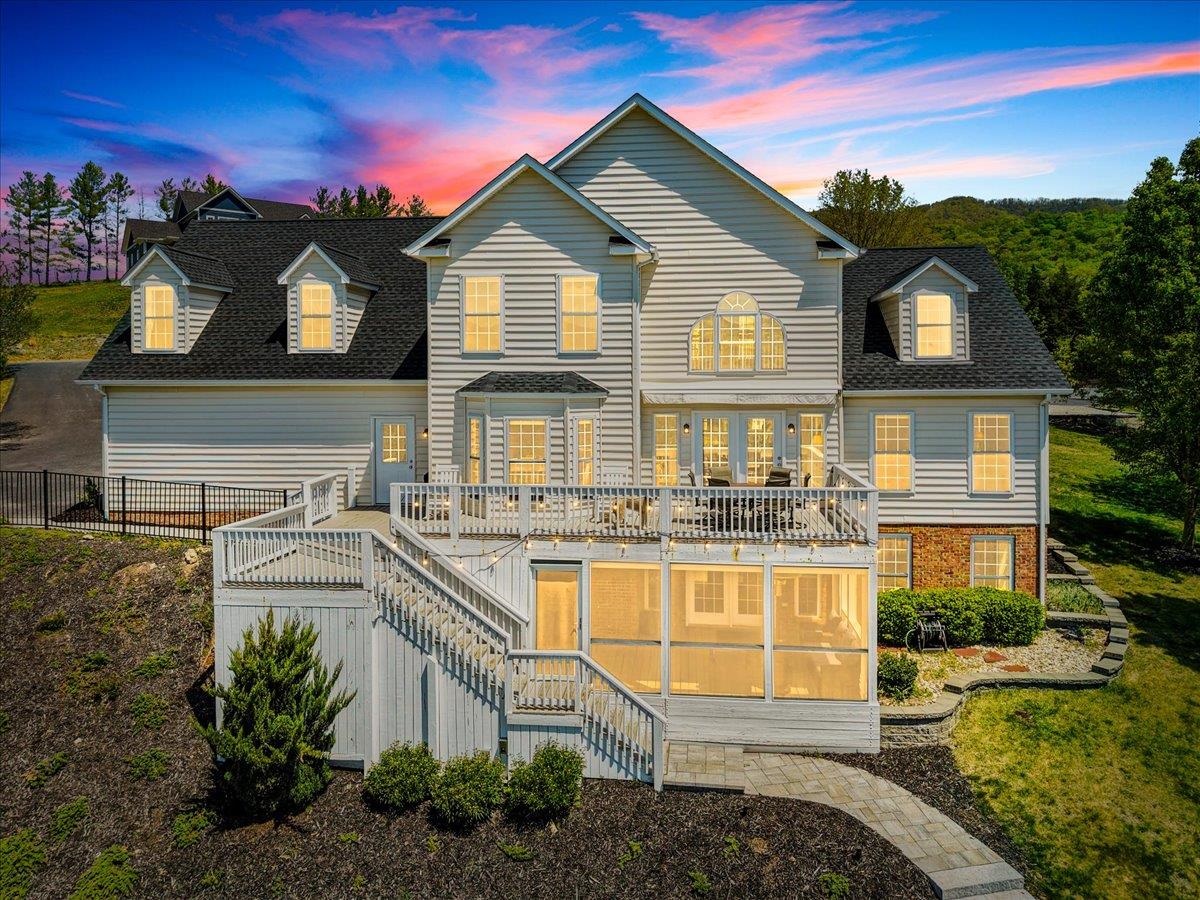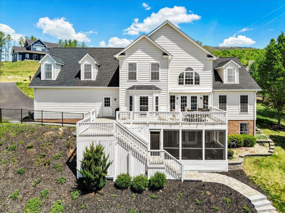 Experience luxury living in this stunning residence perfectly perched above the prestigious Blacksburg Country Club. Situated directly above the 4th green and 5th tee box, the property offers a bird’s-eye view of the course. Beyond the manicured greens, your gaze is met with breathtaking, panoramic vistas of the Ellett Valley and the layered peaks of the Blue Ridge Mountains. Whether it’s morning coffee on the screened porch or an evening by the firepit, the scenery is your constant backdrop. Spanning over 4,300 square feet, this 5-bedroom home is designed for both grand entertaining and comfortable daily living.The thoughtful layout features a spacious primary suite on the main floor, along with a gourmet-ready kitchen and elegant formal spaces. The upper level boasts four generous bedrooms, while the finished walk-out basement provides the ultimate recreation space, complete with a game room and patio access.